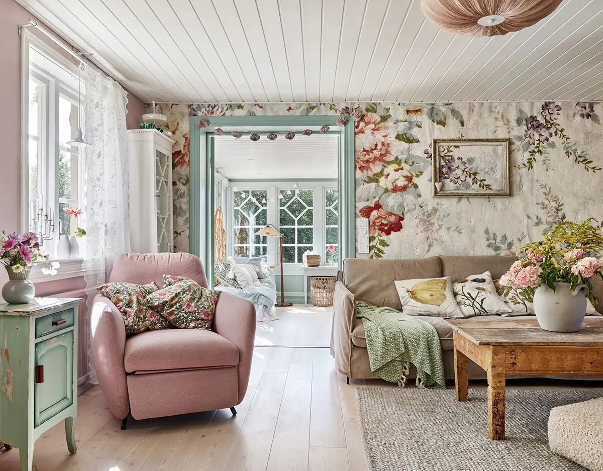 Schöne pastellfarbene blüteninterior-Designs einer schwedischen Ferienhaus