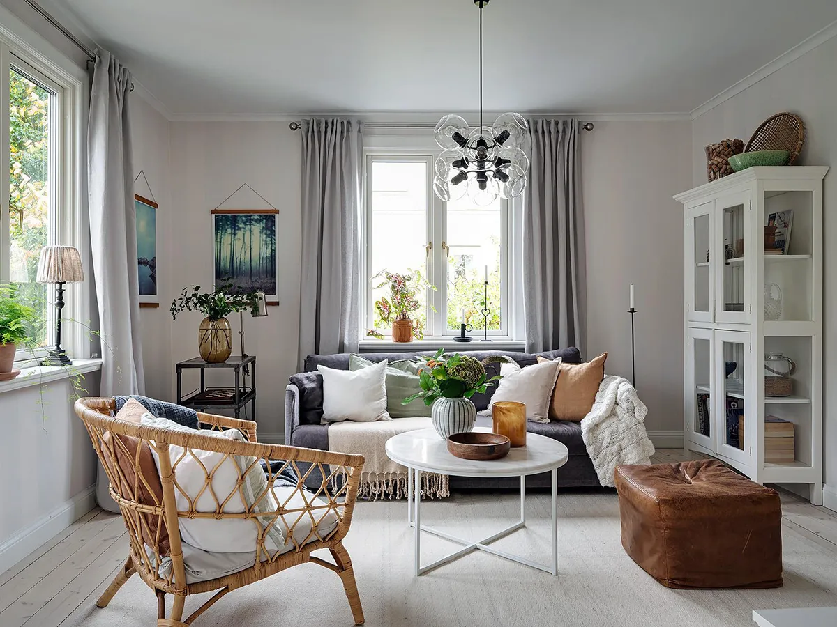 Atmosphärische blühdurchzogene Wandverkleidungen im skandinavischen Stil der schwedischen Datsche