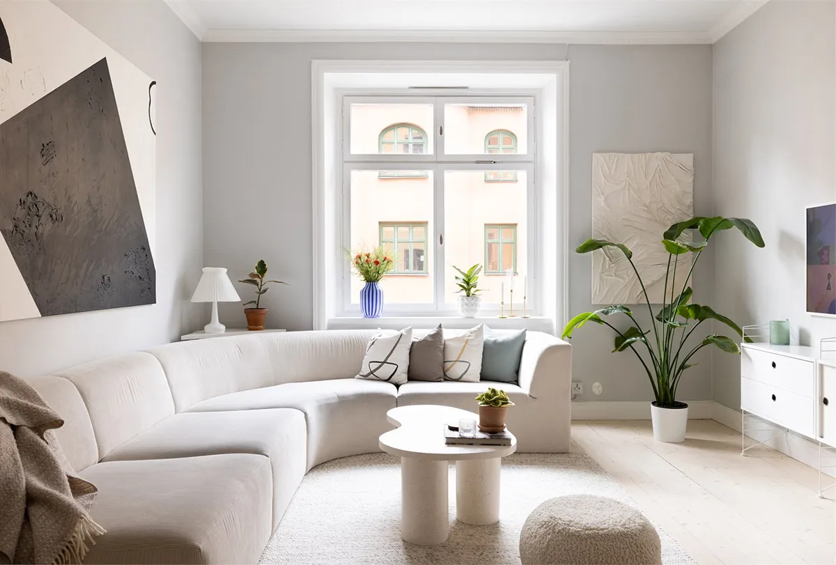 Designsofa und kühle Pastelltöne: Ungewöhnliche skandinavische Wohnung (73 qm)