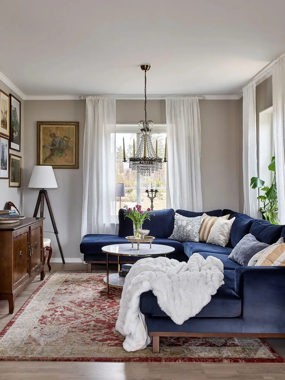 Gemütliche graue Interieurs einer ländlichen Ferienhaus in Schweden
