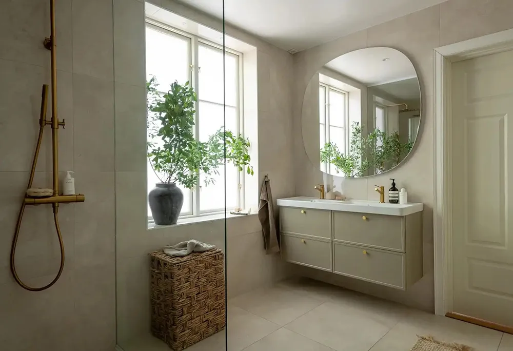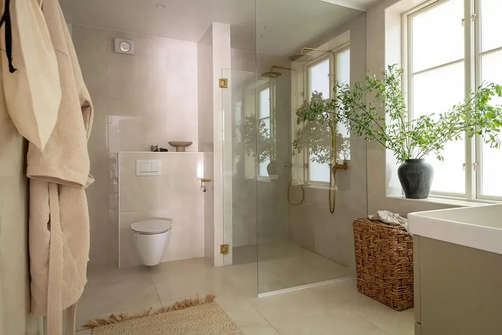 Weicher und eleganter moderner Interior eines ländlichen Feriencottages in Schweden