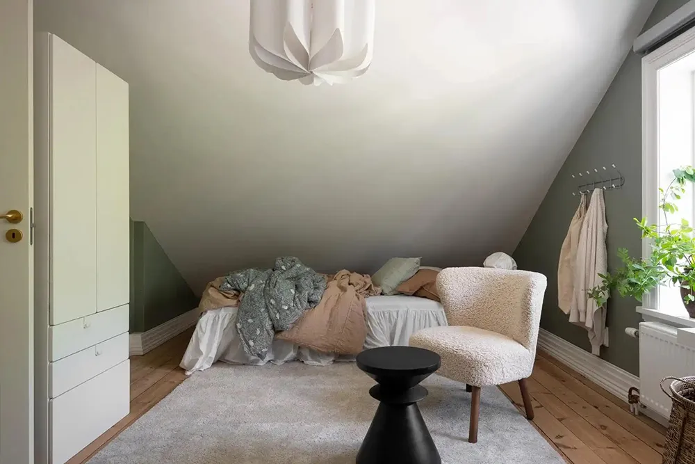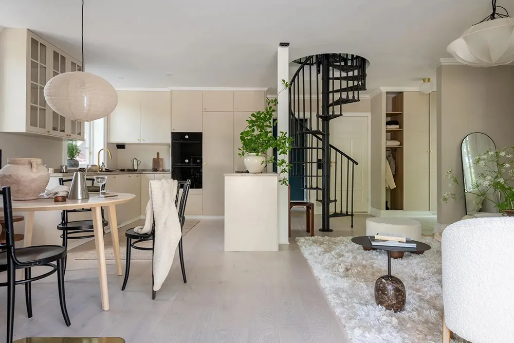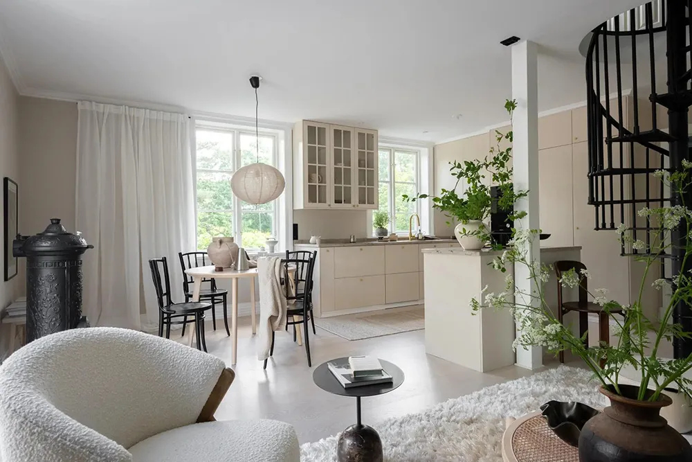 Sanfter monochromer Interior einer kleinen Wohnung in Stockholm (38 qm)