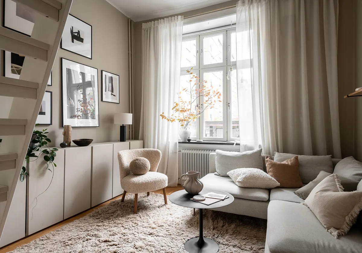 Kleine skandinavische Wohnung in einer schönen, gedämpften Farbpalette (37 qm)