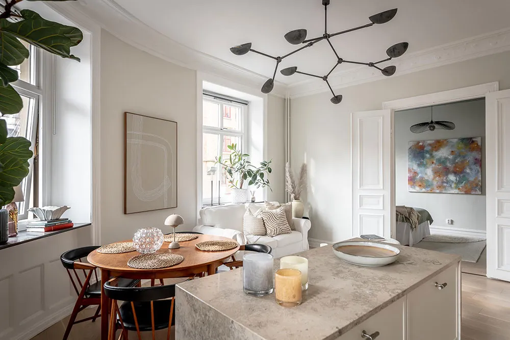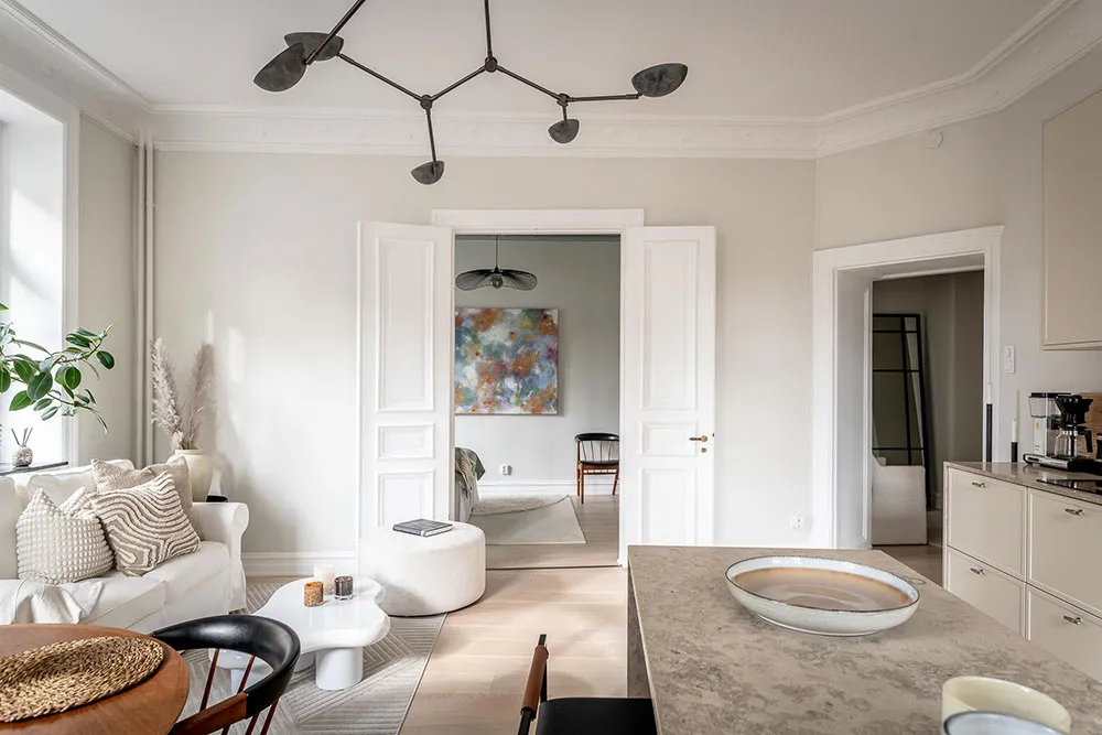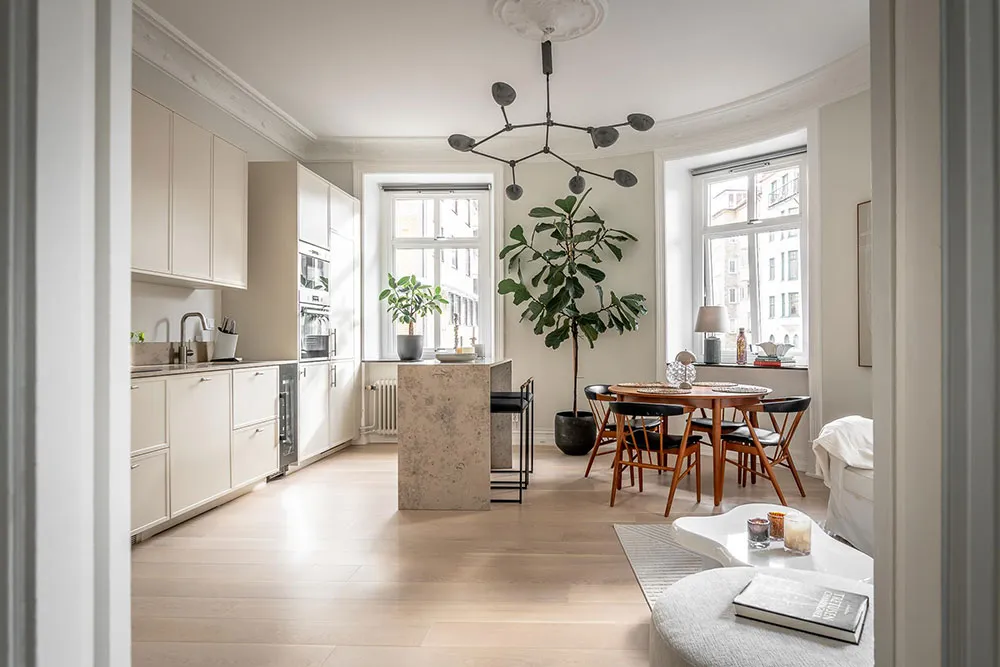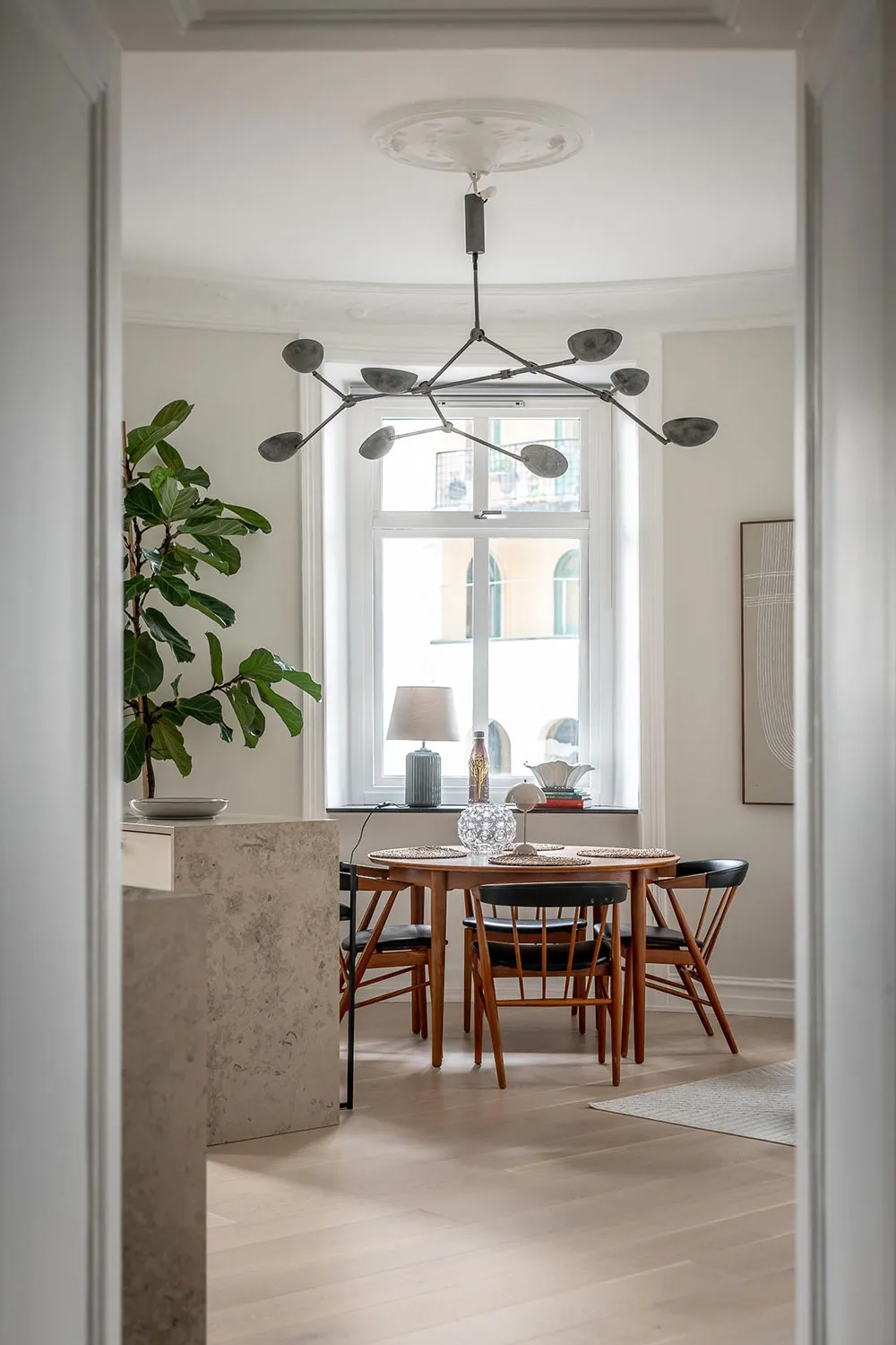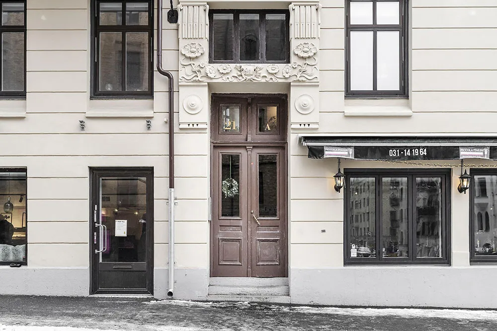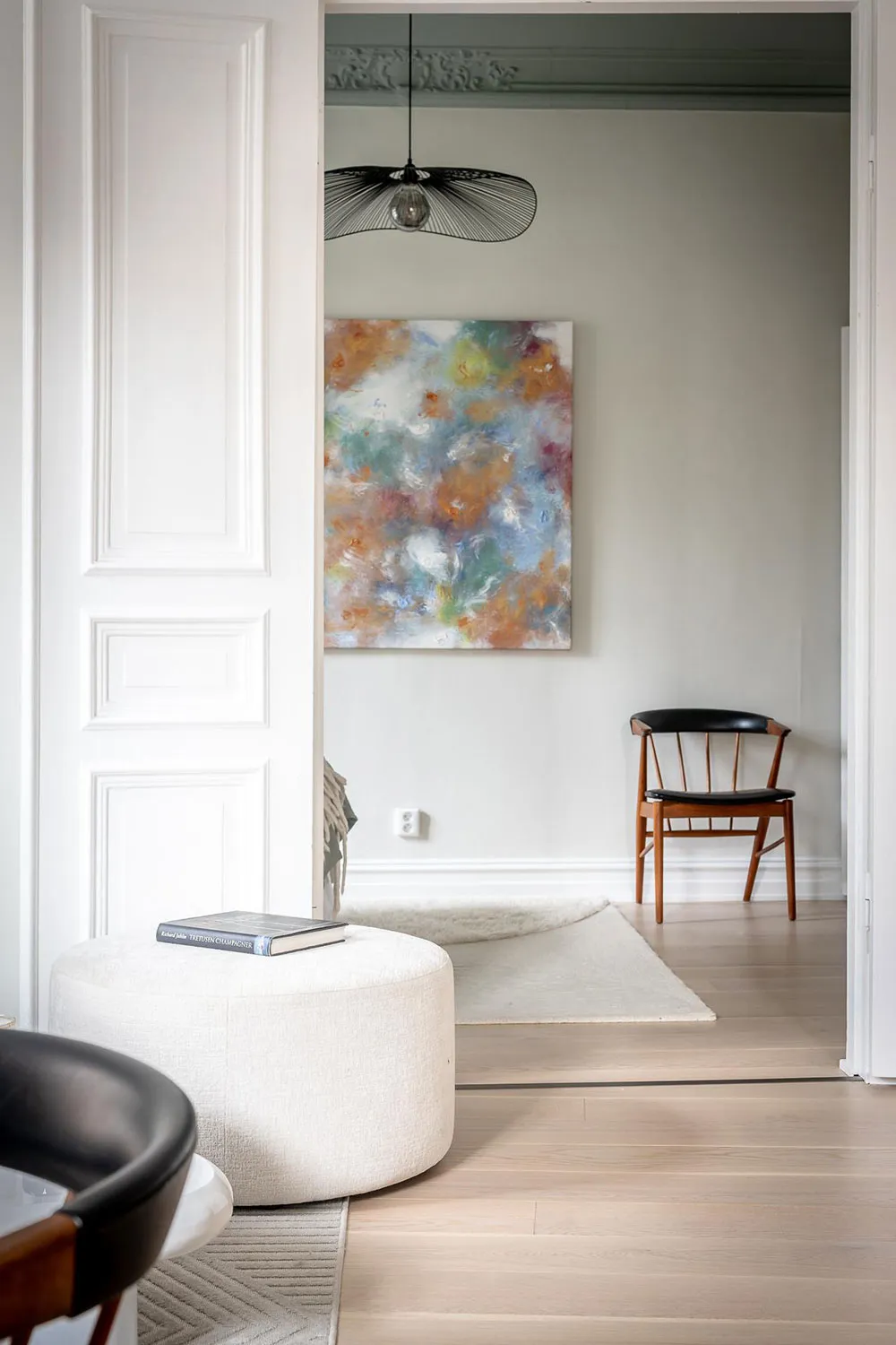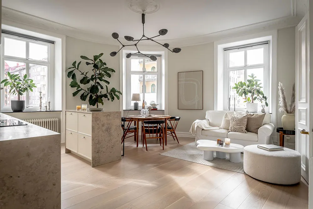 Die Besonderheit dieser hellen und gemütlichen Wohnung in Gotenburg ist die radiale Wand im Wohnzimmer – die Wohnung verfügt über eine Eckenlage in einem historischen Haus im Zentrum.