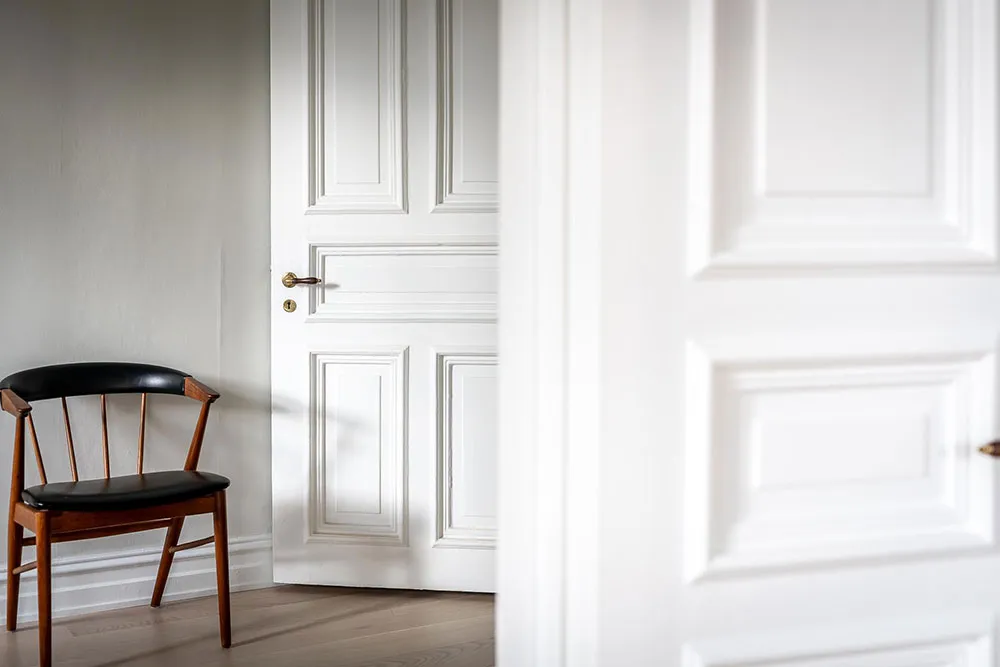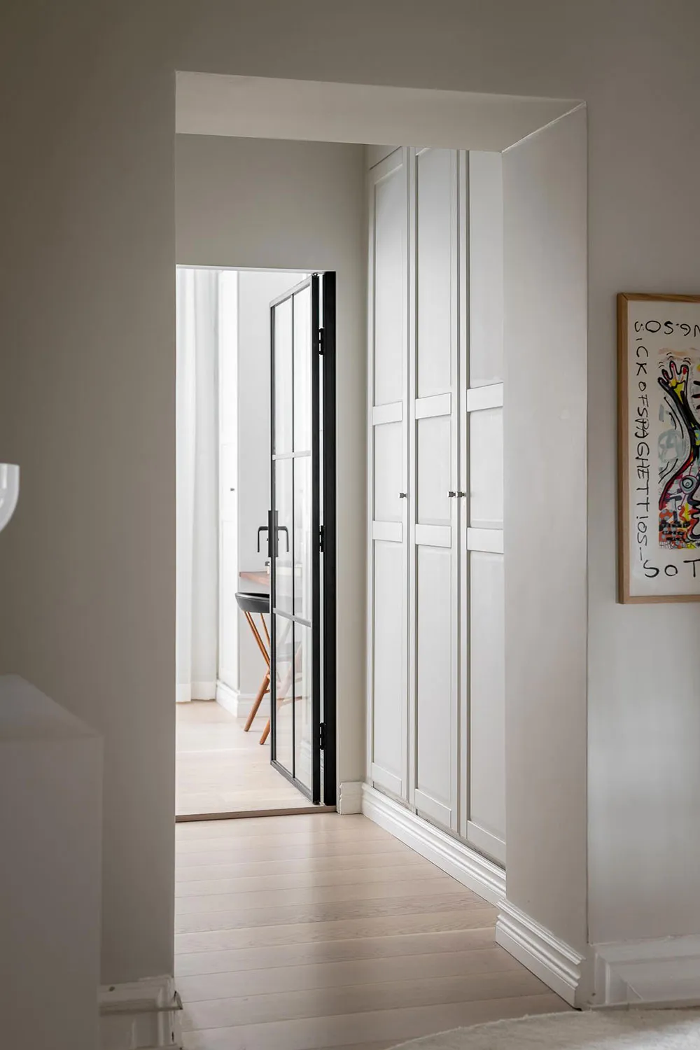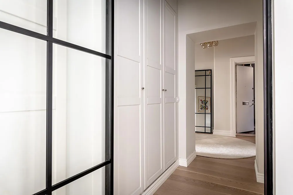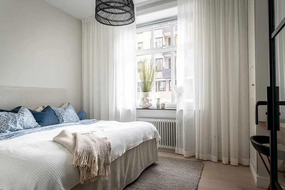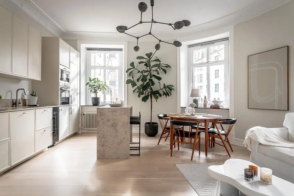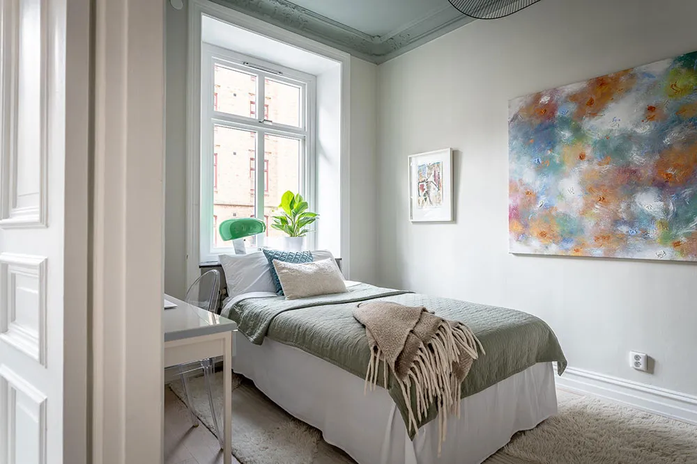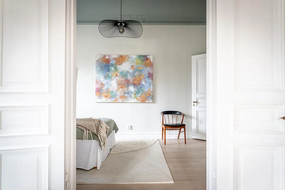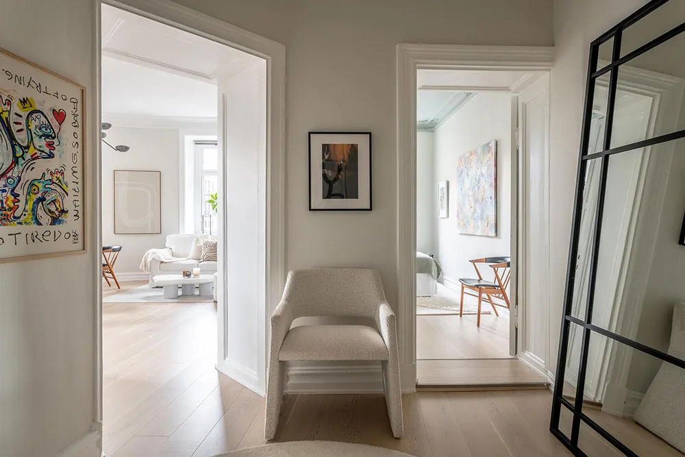 Die Besonderheit dieser hellen und gemütlichen Wohnung in Gotenburg ist die radiale Wand im Wohnzimmer – die Wohnung verfügt über eine Eckenlage in einem historischen Haus im Zentrum.