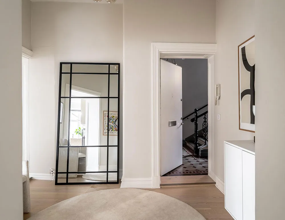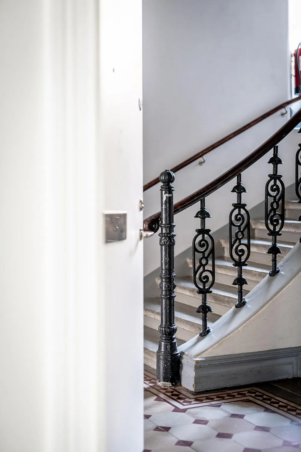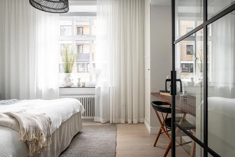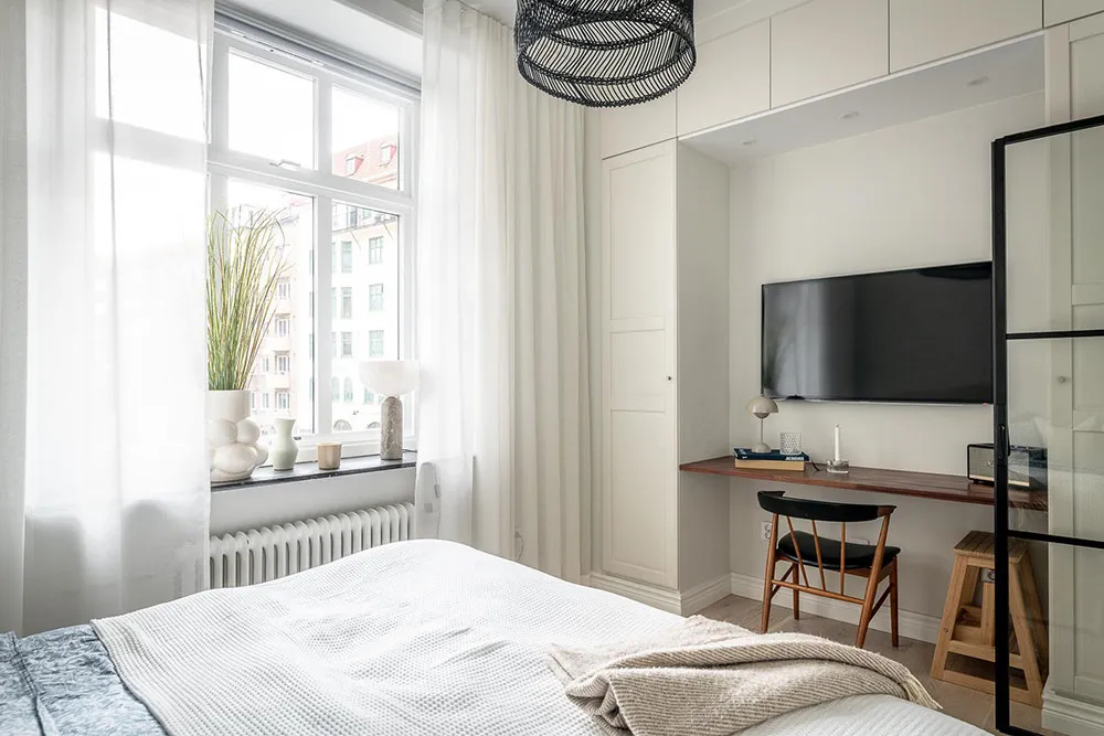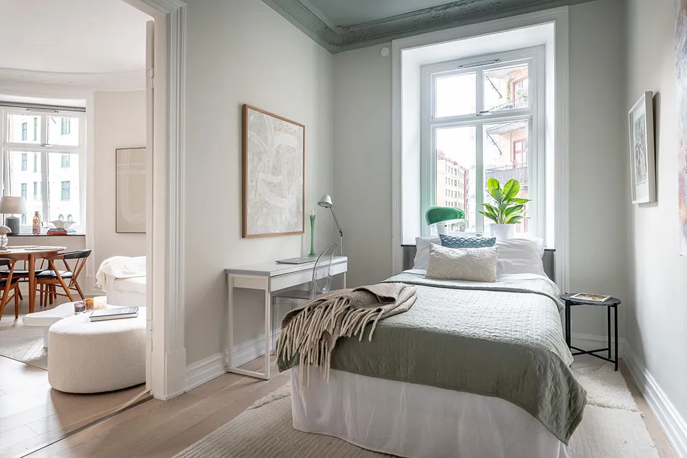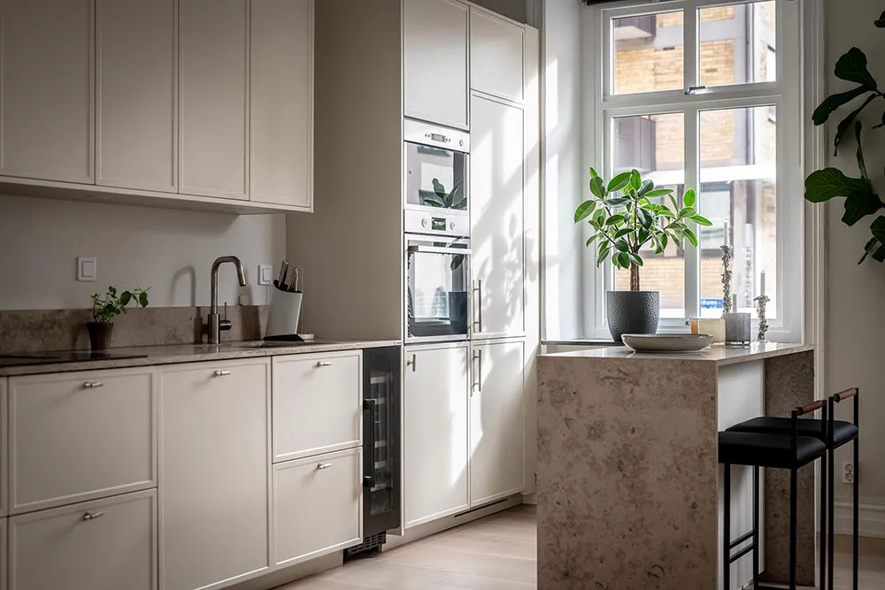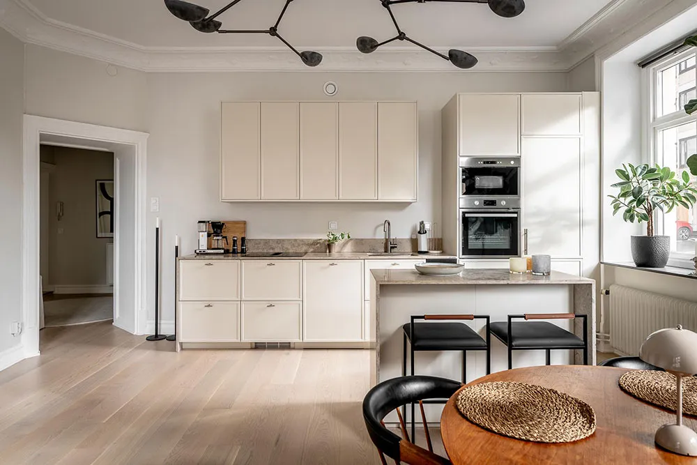 Die Besonderheit dieser hellen und gemütlichen Wohnung in Gotenburg ist die radiale Wand im Wohnzimmer – die Wohnung verfügt über eine Eckenlage in einem historischen Haus im Zentrum.