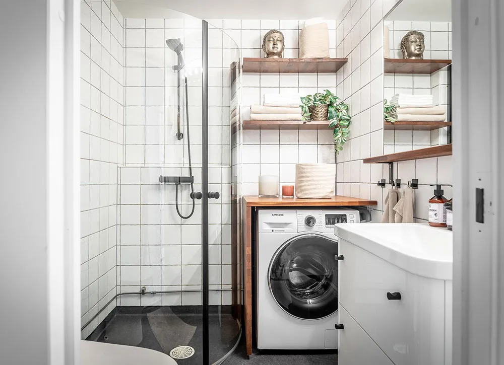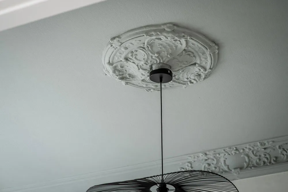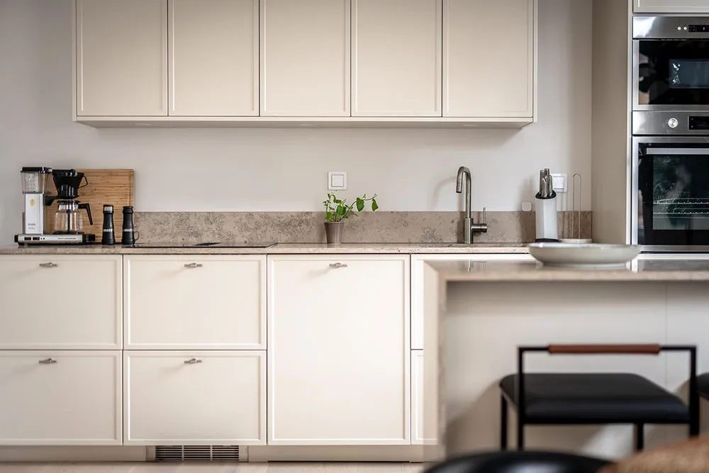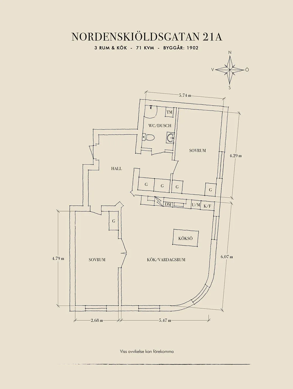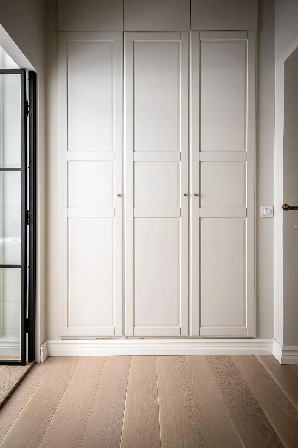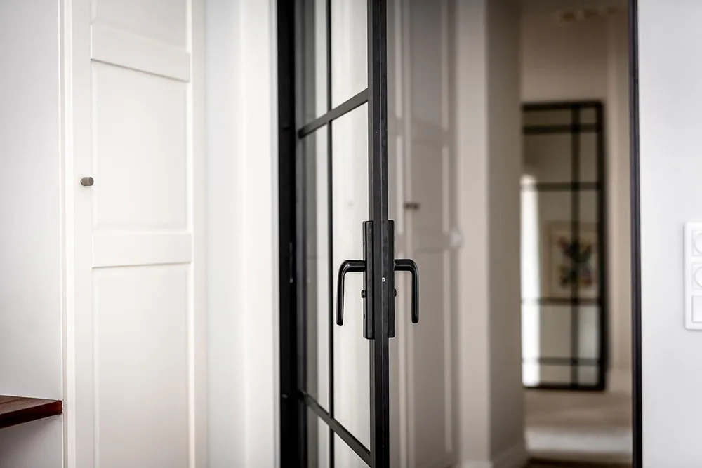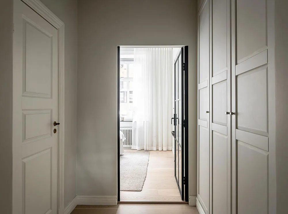 Die Besonderheit dieser hellen und gemütlichen Wohnung in Gotenburg ist die radiale Wand im Wohnzimmer – die Wohnung verfügt über eine Eckenlage in einem historischen Haus im Zentrum.