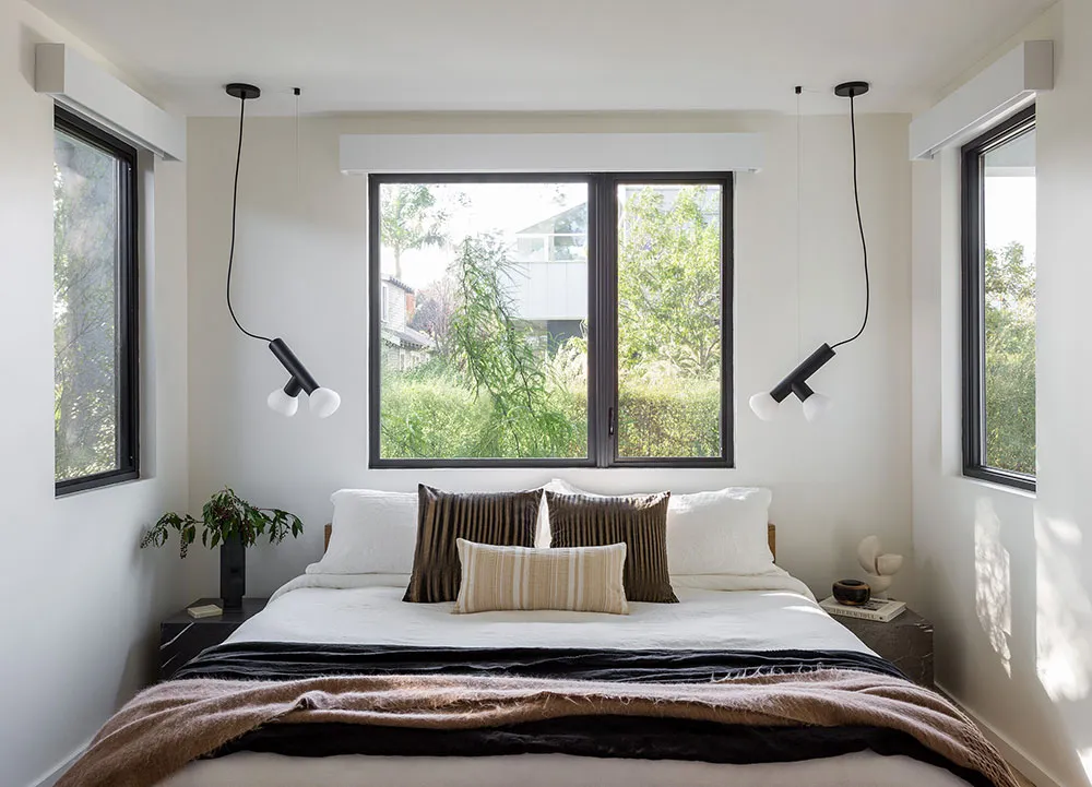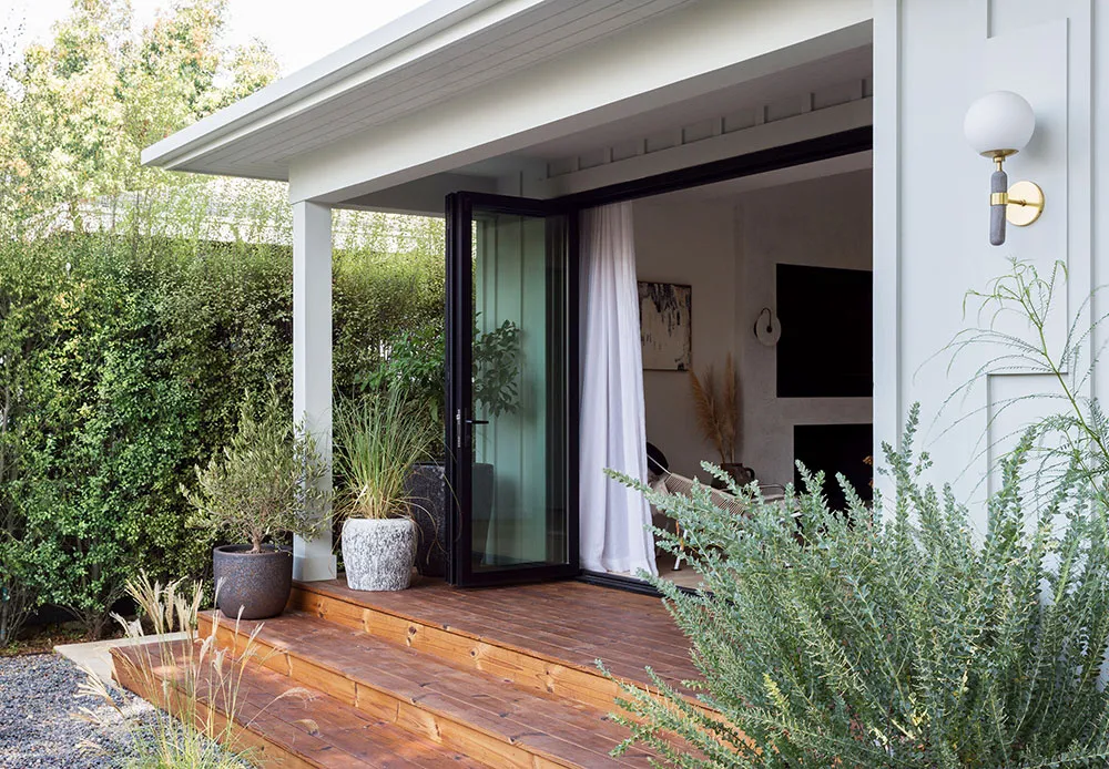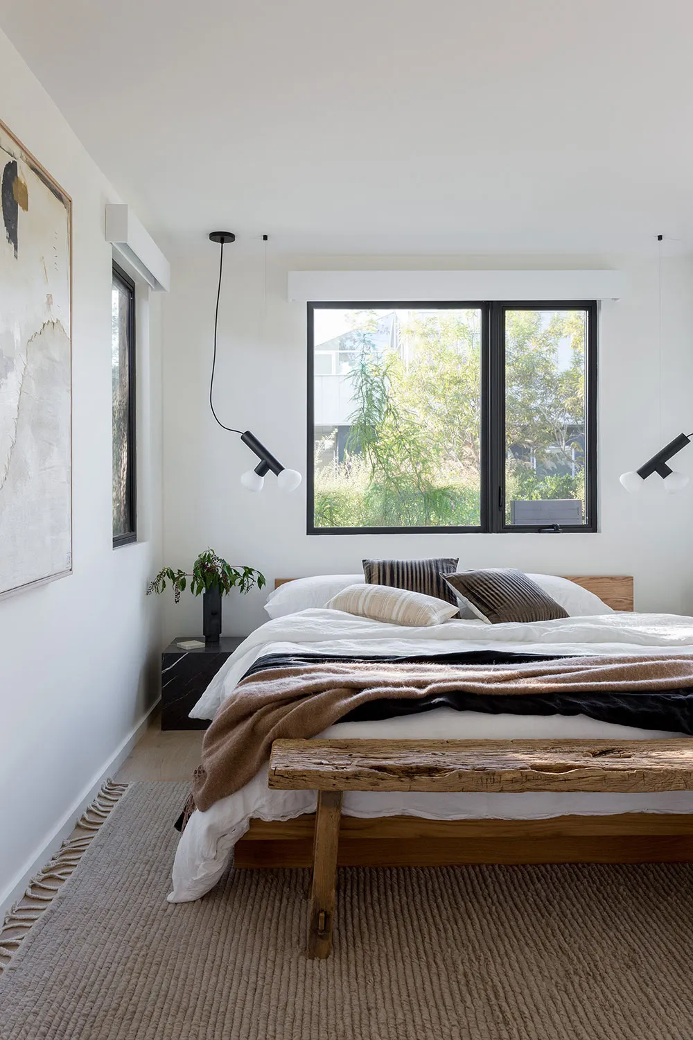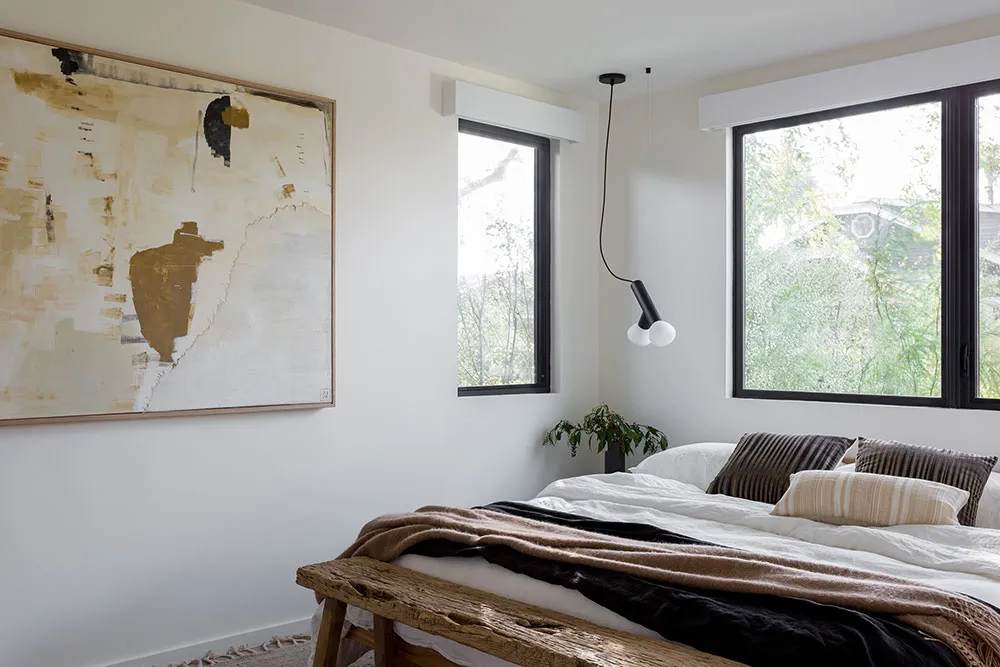 Wenn man alle Möbel aus diesem kleinen Haus in Kalifornien entfernt, erhält man einen vollständig weißen offenen Raum mit Scheunenboden und hellem Holzboden.