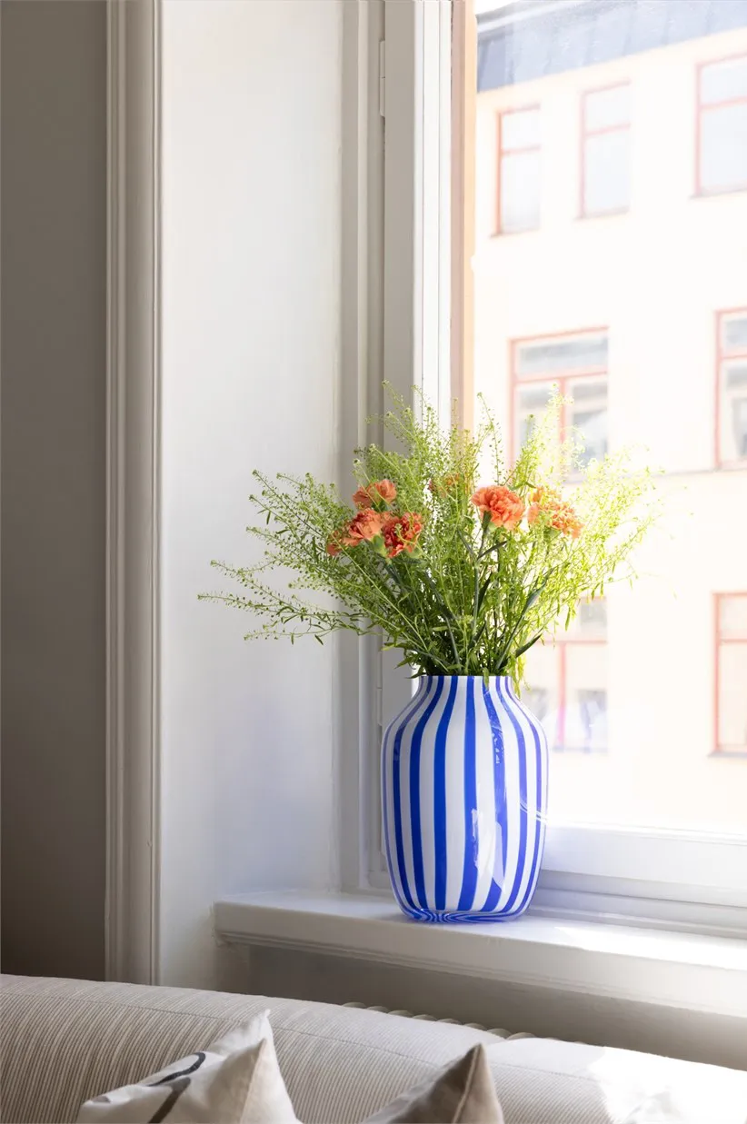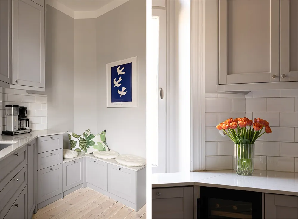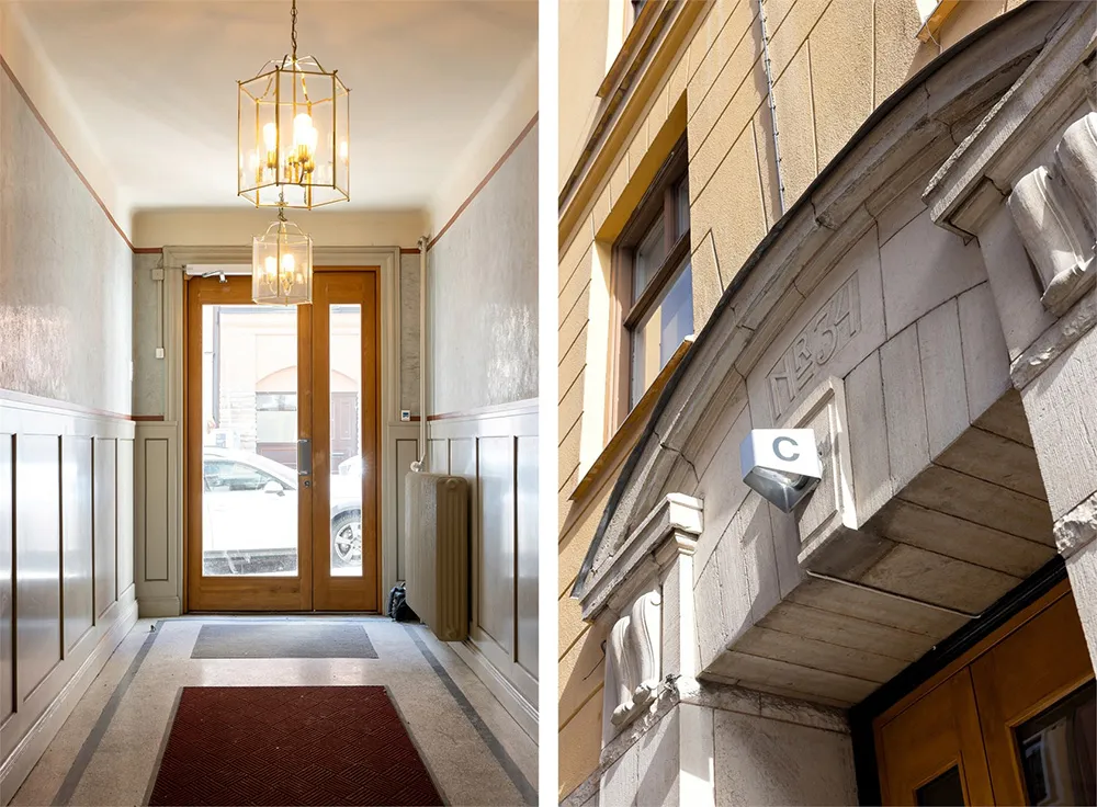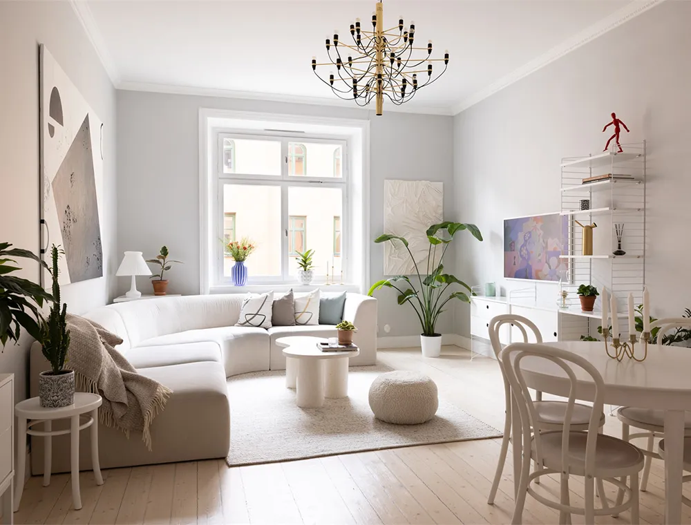In der Wohnzimmer dieser schwedischen Wohnung herrscht eine sehr modische und sogar etwas glamouröse Einrichtung.