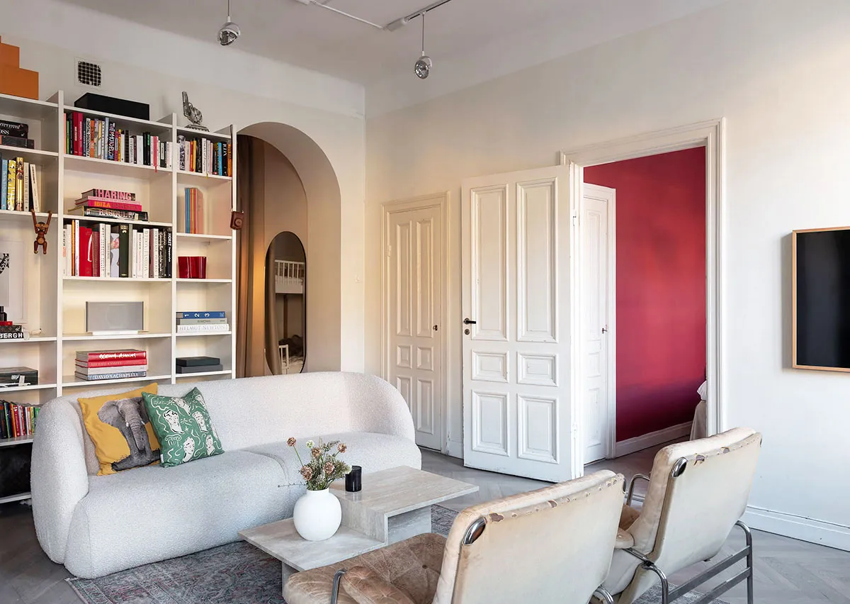 Kleine, elegante Wohnung mit rotem Schlafzimmer: Stockholm (57 qm)