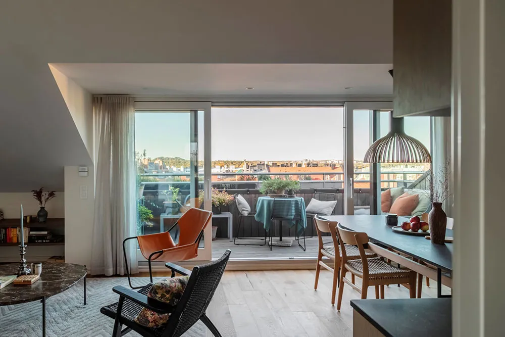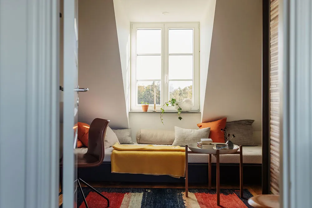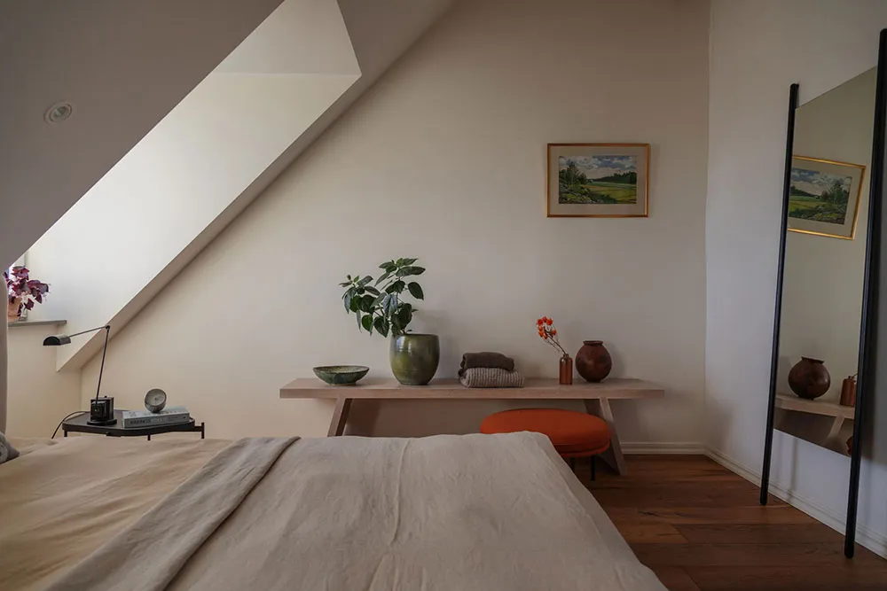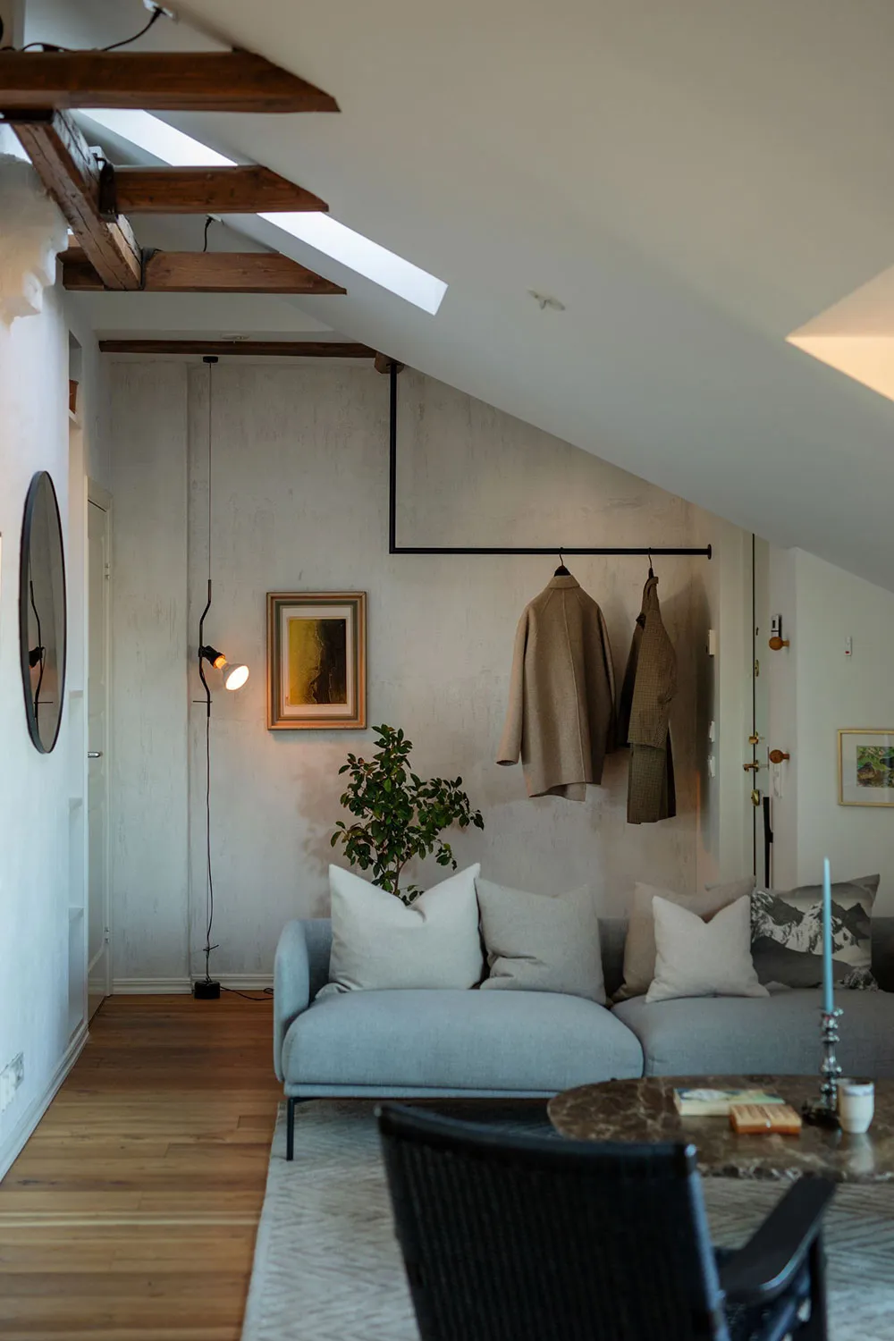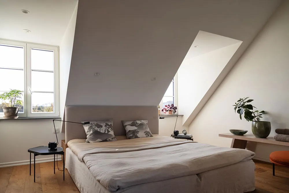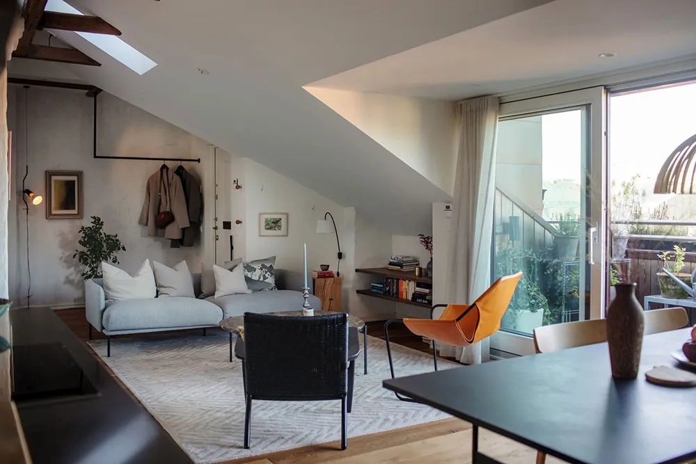 Diese Dachstockwohnung befindet sich unter der Dachdecke eines 100-jährigen Hauses in Stockholm, wobei ihre Fenster auf beide Seiten blicken. So können die Eigentümer fast den ganzen Tag von den Sonnenstrahlen geniesen.
