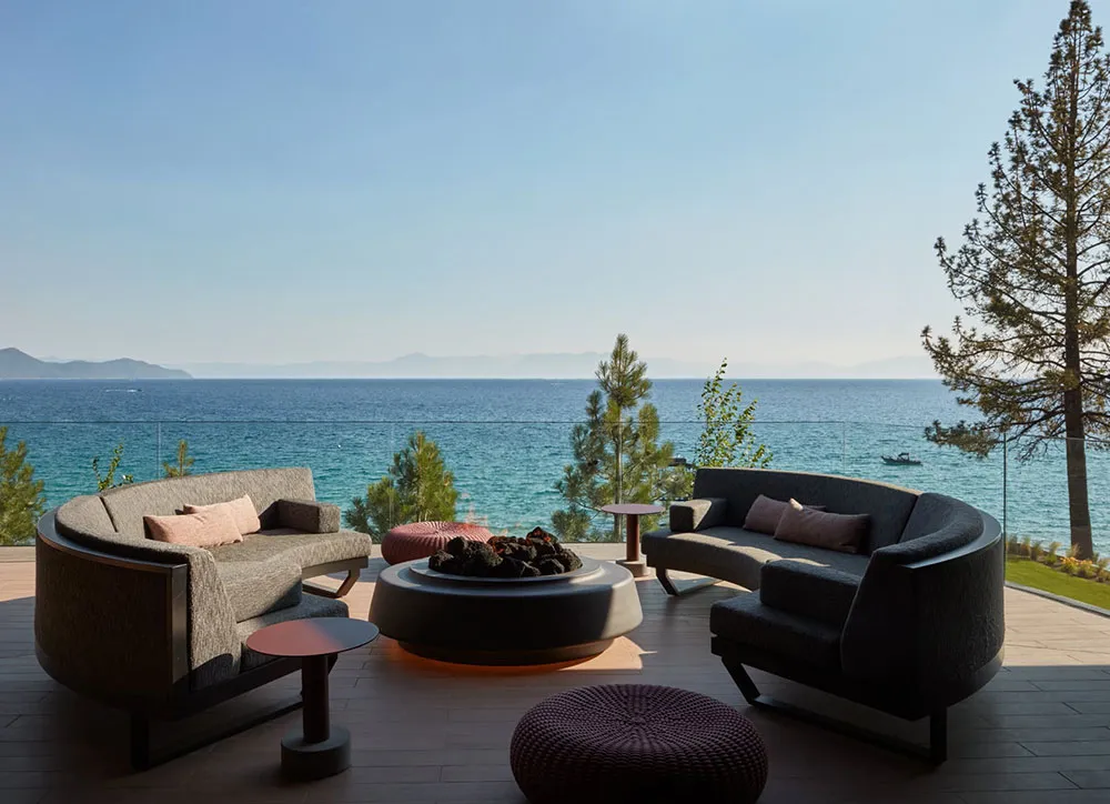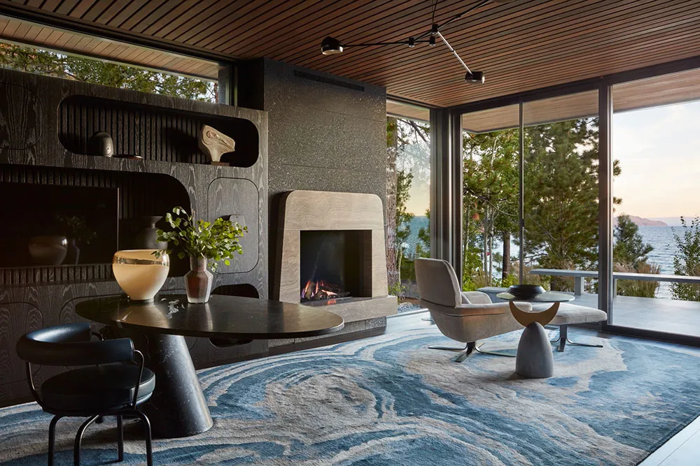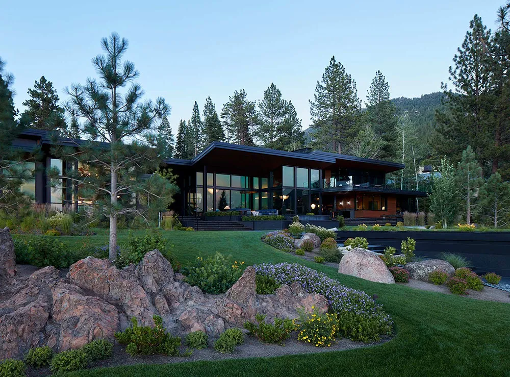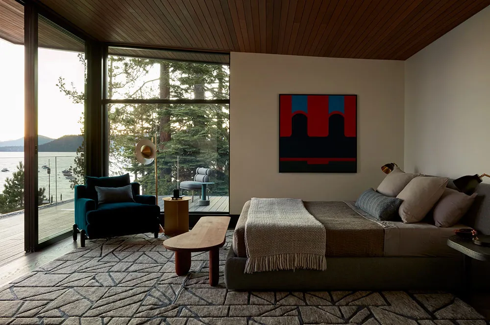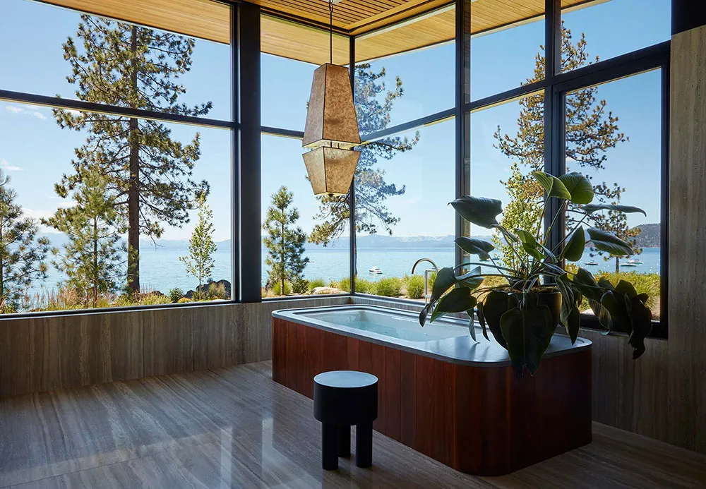Dass dies ein luxurioser und beeindruckender Haus ist, zeigt bereits die Wohnzimmerfläche – ein offenes 150 Quadratmeter großes Raum mit unglaublich hohen Decken und glasklaren Wänden, die auf den Tahoe-See hinausragen.