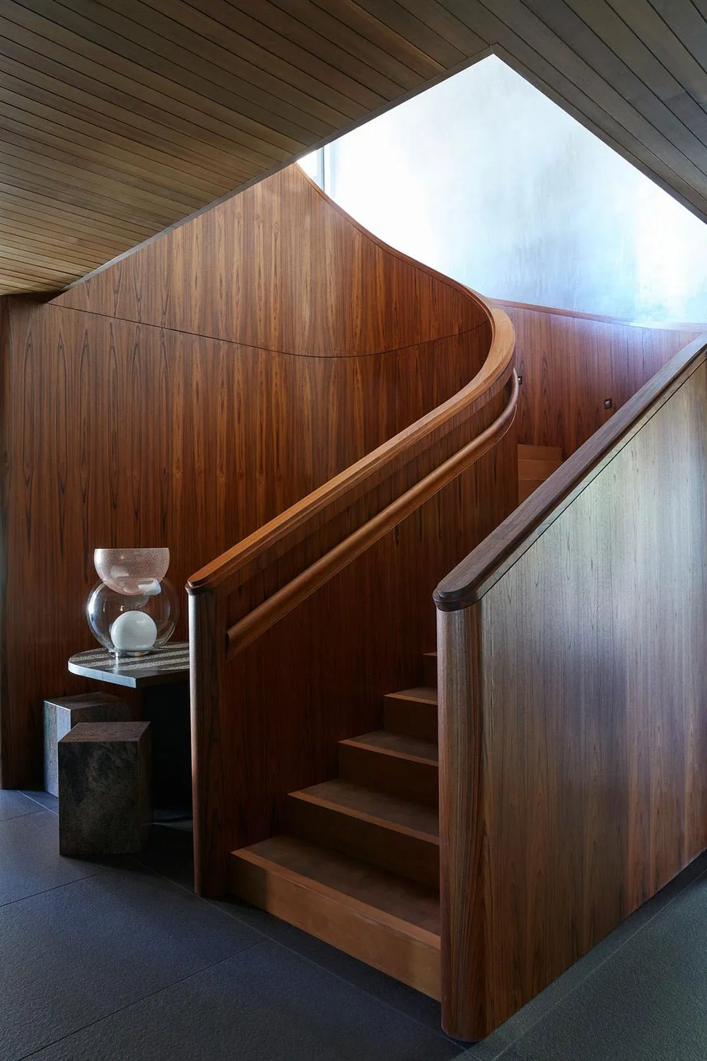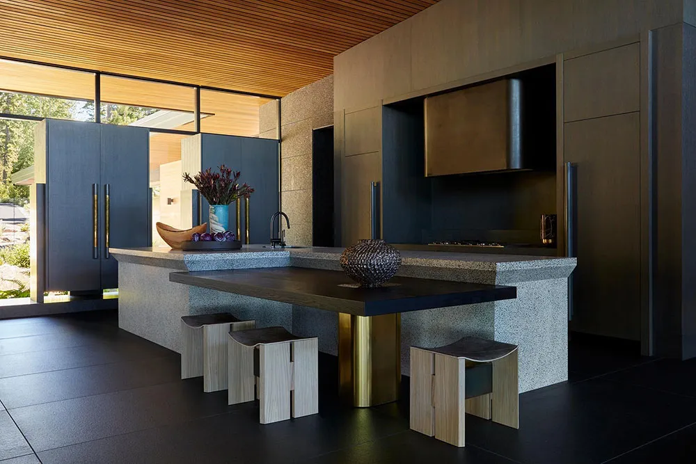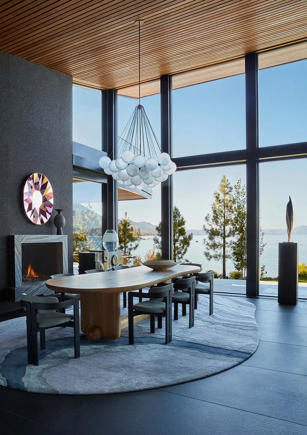 Dass dies ein luxurioser und beeindruckender Haus ist, zeigt bereits die Wohnzimmerfläche – ein offenes 150 Quadratmeter großes Raum mit unglaublich hohen Decken und glasklaren Wänden, die auf den Tahoe-See hinausragen.
