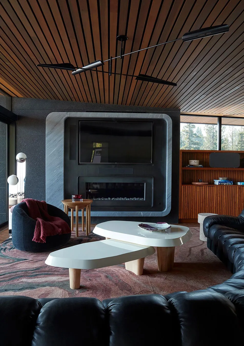 Atmosphärische und stylische dunkle Innenausstattungen moderner Holzhütte im Wald