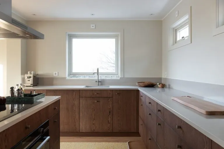 At the center of the transformation is a floating linear battened ceiling with integrated lighting that spans the entire great room. This element not only enhances visual coherence but also subtly defines the kitchen, dining area, and living zone within the open space. The overall effect is spatial clarity and architectural warmth.