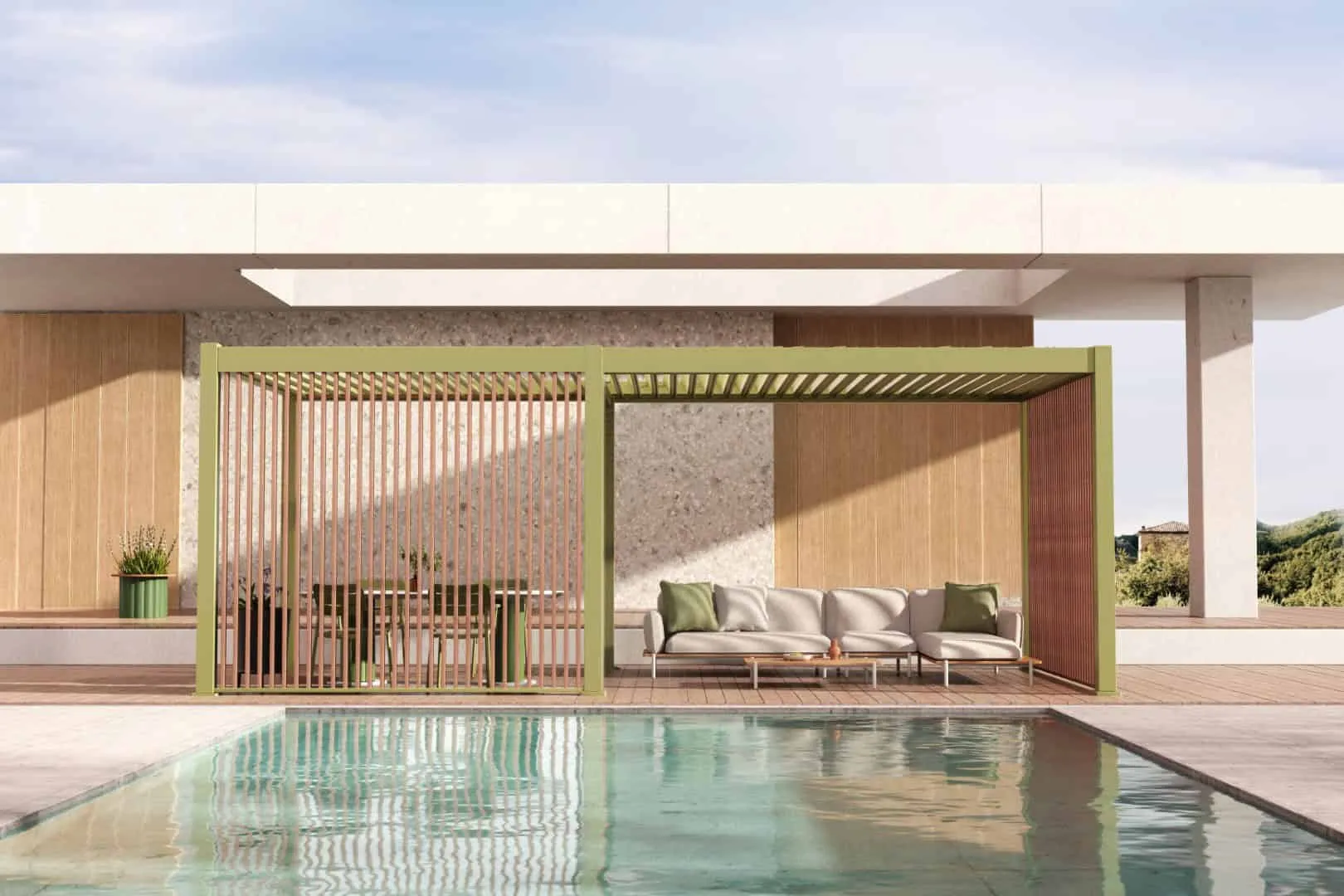 PinterestIn harmony with the existing building featuring modern and clean lines, this 65 m² pool house with a nearby utility room includes a living area under a red cedar pergola in warm tones.