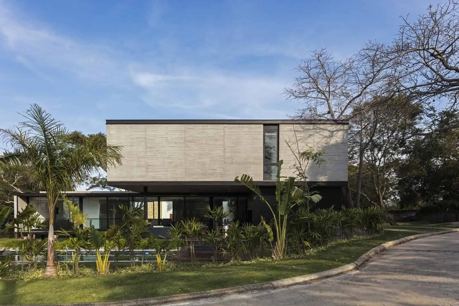 Materials such as brick, concrete, glass, and metal define the building's clean yet expressive form. The facade is adorned with textured exterior paint, complemented by black sheet metal details, giving it a bold industrial aesthetic. The entrance makes a sculptural impact using 60mm thick Indian black granite slabs — a distinctive element that accentuates the home's individuality.