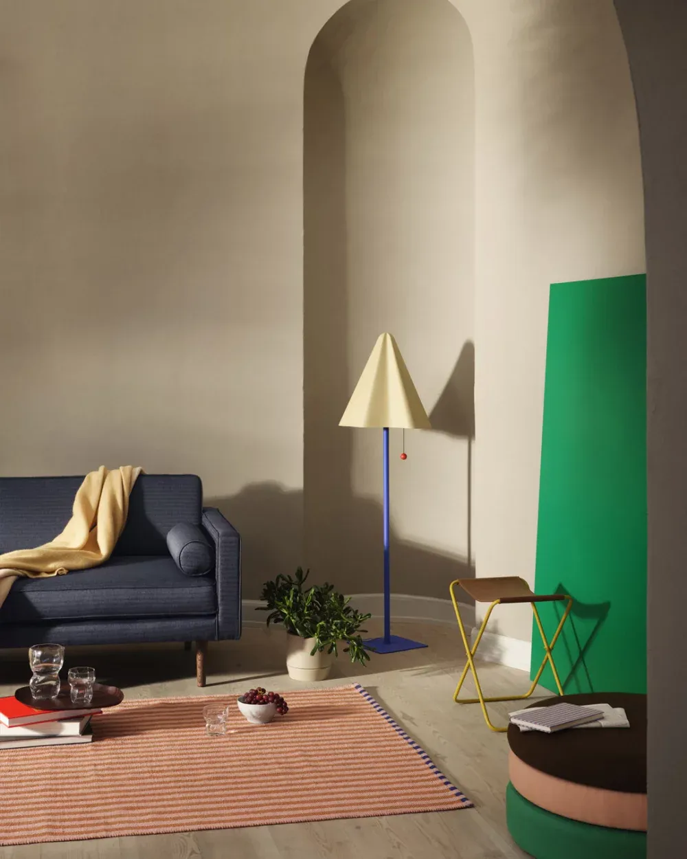 If you want Scandinavian living room design, stay minimalistic with a few plants and light wooden elements.