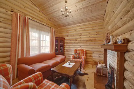 A wooden house immediately evokes thoughts of a cabin in a quiet village, a log cabin, and forest scents. The interior of a living room in a wooden house, on the other hand, is limited in style choices. Hi-tech, English style, or minimalism here would not look harmonious. Such a living room is better suited to country, Scandinavian, and chalet styles.