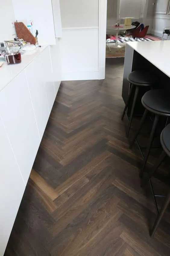 Green Smoked Oak Parquet Floors in Herringbone Style Add Elegance to Your Dining Room