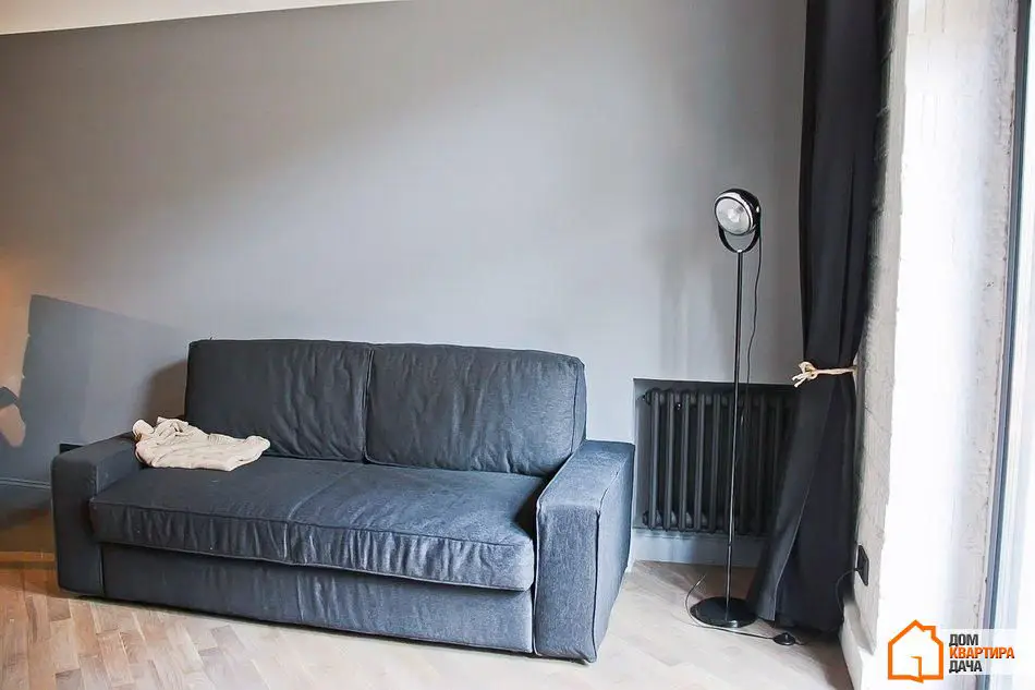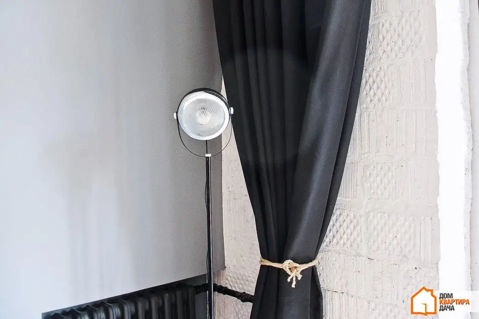 The entire decor in the apartment is very simple, with most accessories in black. The textiles were sewn on order from natural materials. The kitchen floor tiles were originally intended to be slate, but we later found a more budget-friendly option in the same style. The radiators were replaced with Soviet-era cast iron models and painted black together with the pipes.