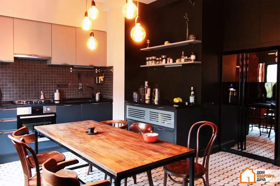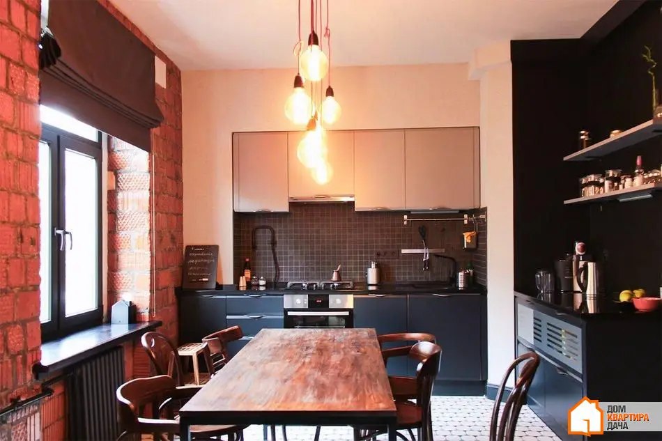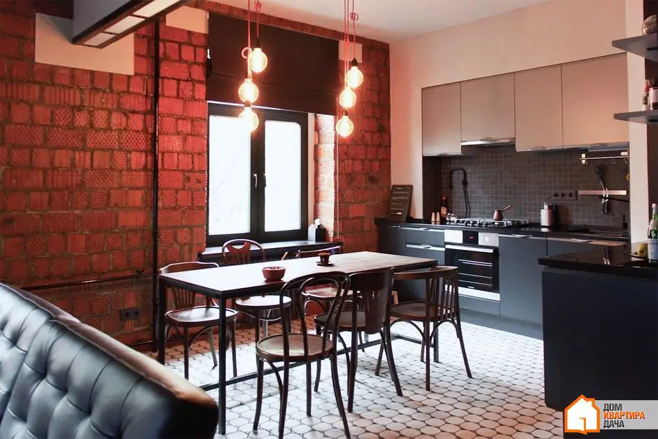 The interior features elements of the loft style — exposed brick walls, black accessories, and wall finishes resembling concrete.