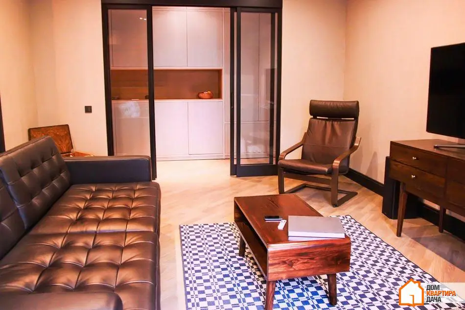Single men are usually uncomplicated clients and almost always trust the designer with their future interior. However, in this case, the apartment owner was actively involved in designing his future living space. For hosting guests, he proposed to dedicate the kitchen area, which the designer merged with the living room to increase the space.