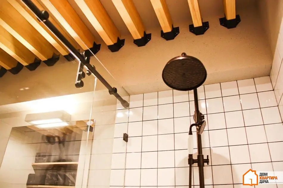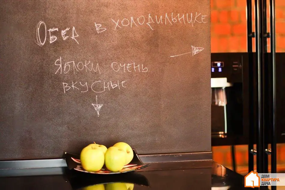 The overall color palette is monochromatic and restrained, but bright accents are added: a brick wall in the living room and floor tiles on the kitchen. The walls in the living room are finished with decorative stucco to look like concrete, and the kitchen walls were painted with magnetic chalk paint. Natural timber was used in the office and bathroom ceiling. The entire apartment's parquet is made of old oak but was repainted in a different shade.