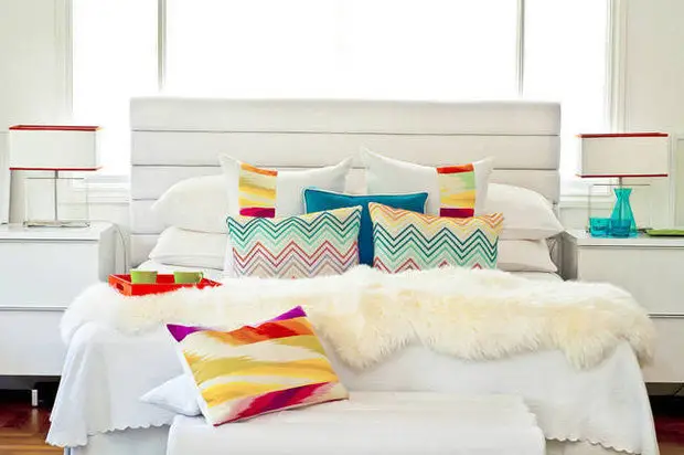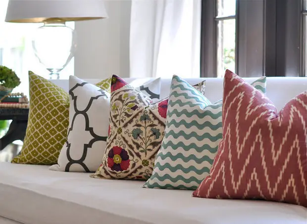Narrow, small sofas are a good option for small apartments. But their backs are often uncomfortable and hard. Fix this flaw by placing several soft, differently shaped cushions on the sofa. Pillowcases with bold colors and patterns on a monochrome sofa will set accents and set the mood.