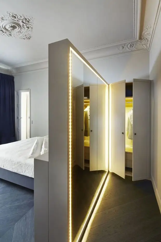Don't forget about internal lighting in wardrobes. Several built-in light bulbs are simply irreplaceable to distinguish one pair of black pants from another. By the way, a good solution is to install several small bulbs around the perimeter of the wardrobe mirror.