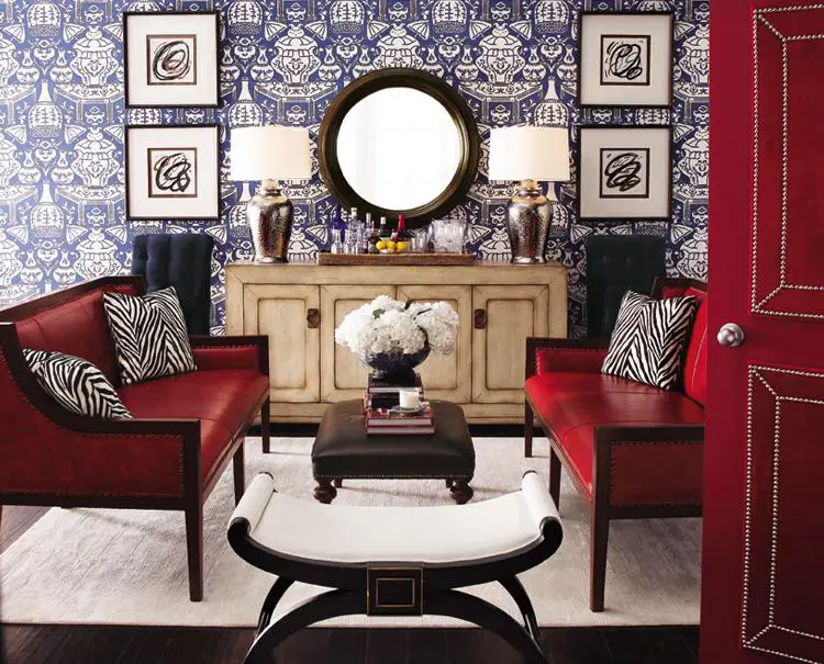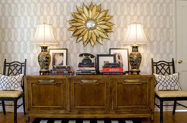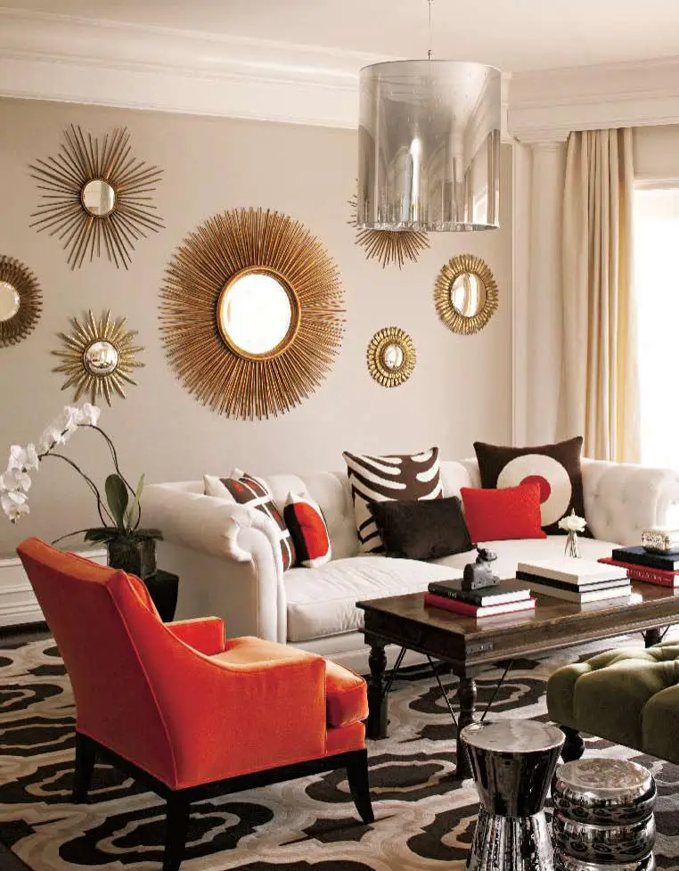 A large circular mirror shaped like the sun with numerous rays fits perfectly into a living room decorated in Art Deco style.