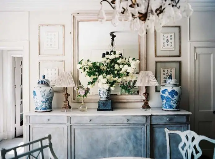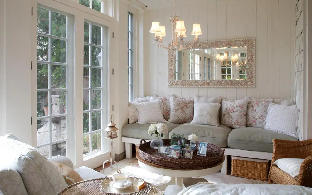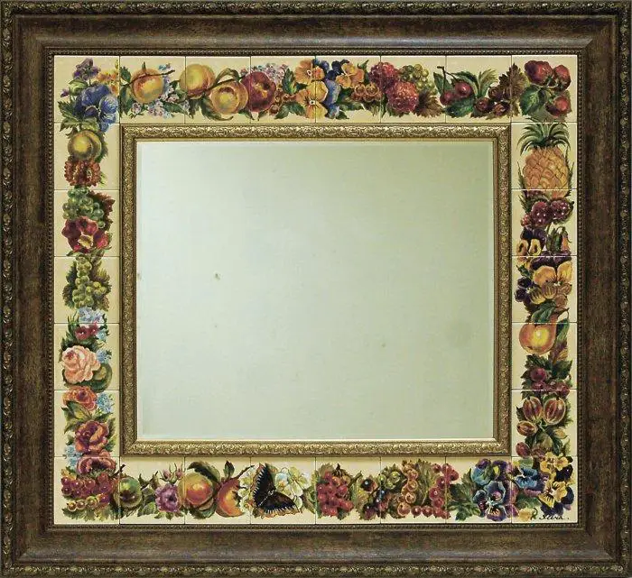 Simple geometric shapes in natural frames work well for country-style interiors. Frames can be wooden, hand-carved, made from rattan, twigs, or decorated with broken or whole ceramic tiles, or seashells.