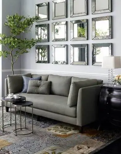 Best results come from mirror panels—individual mirrors of varying sizes arranged into a pattern. These panels add lightness and festivity to a room, which is ideal for a living space. Ideally, place a mirror wall opposite a window so that natural daylight reflects and makes a small room appear larger and brighter.