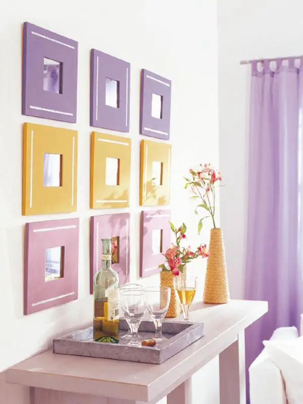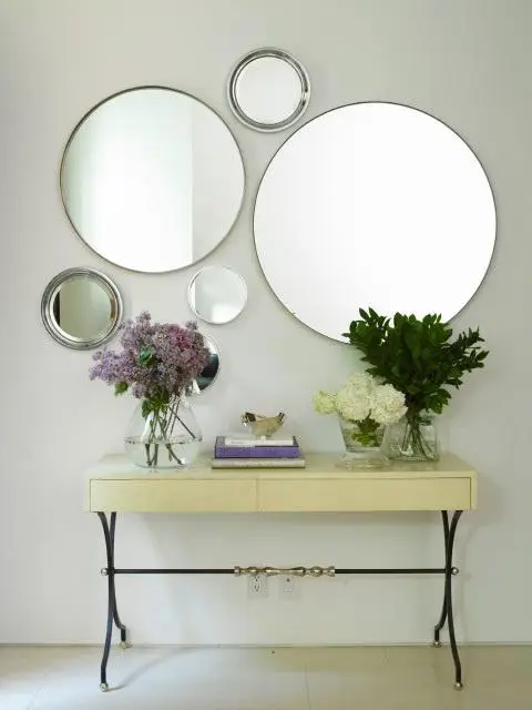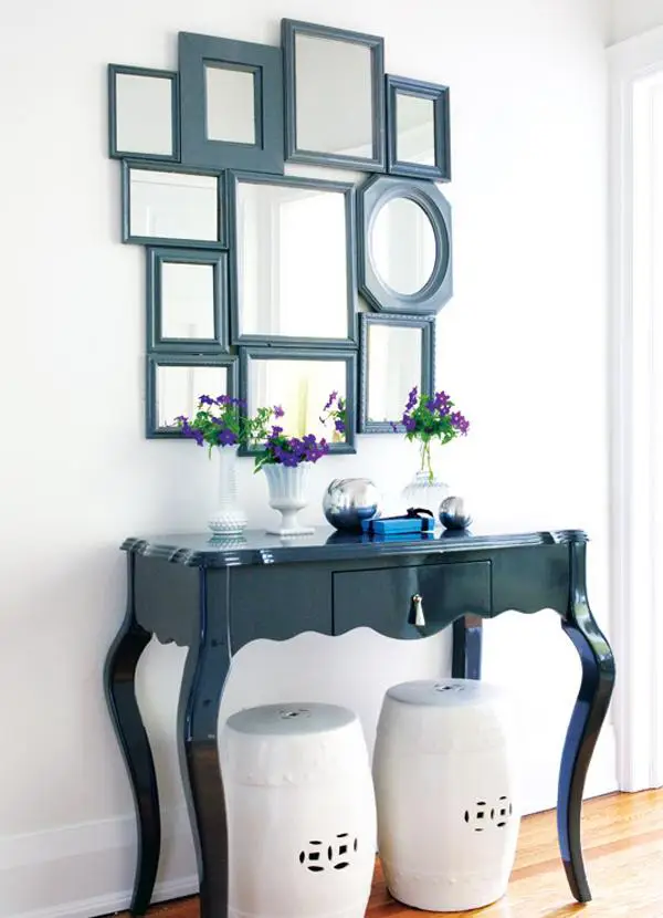 You can frame small mirrors in identical simple frames and hang them on the wall alongside photos. Alternatively, a large mirror surrounded by photo frames of different shapes and sizes—yet matching the style—creates a stylish look.