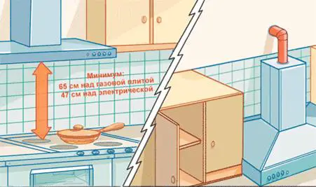 The minimum height for installing the exhaust fan above a gas stove is 65 cm, and for an electric stove, it's 47 cm. This distance is sufficient for safety purposes when the exhaust fan surface heats up.
