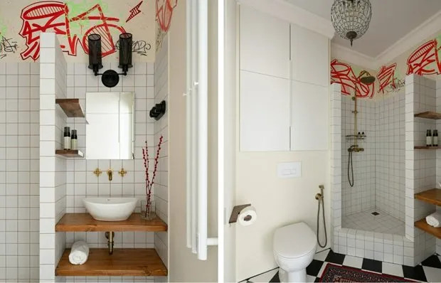 Bright Bathroom with Unusual Layout and Wall Graffiti