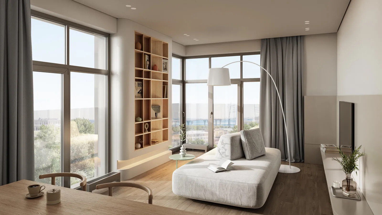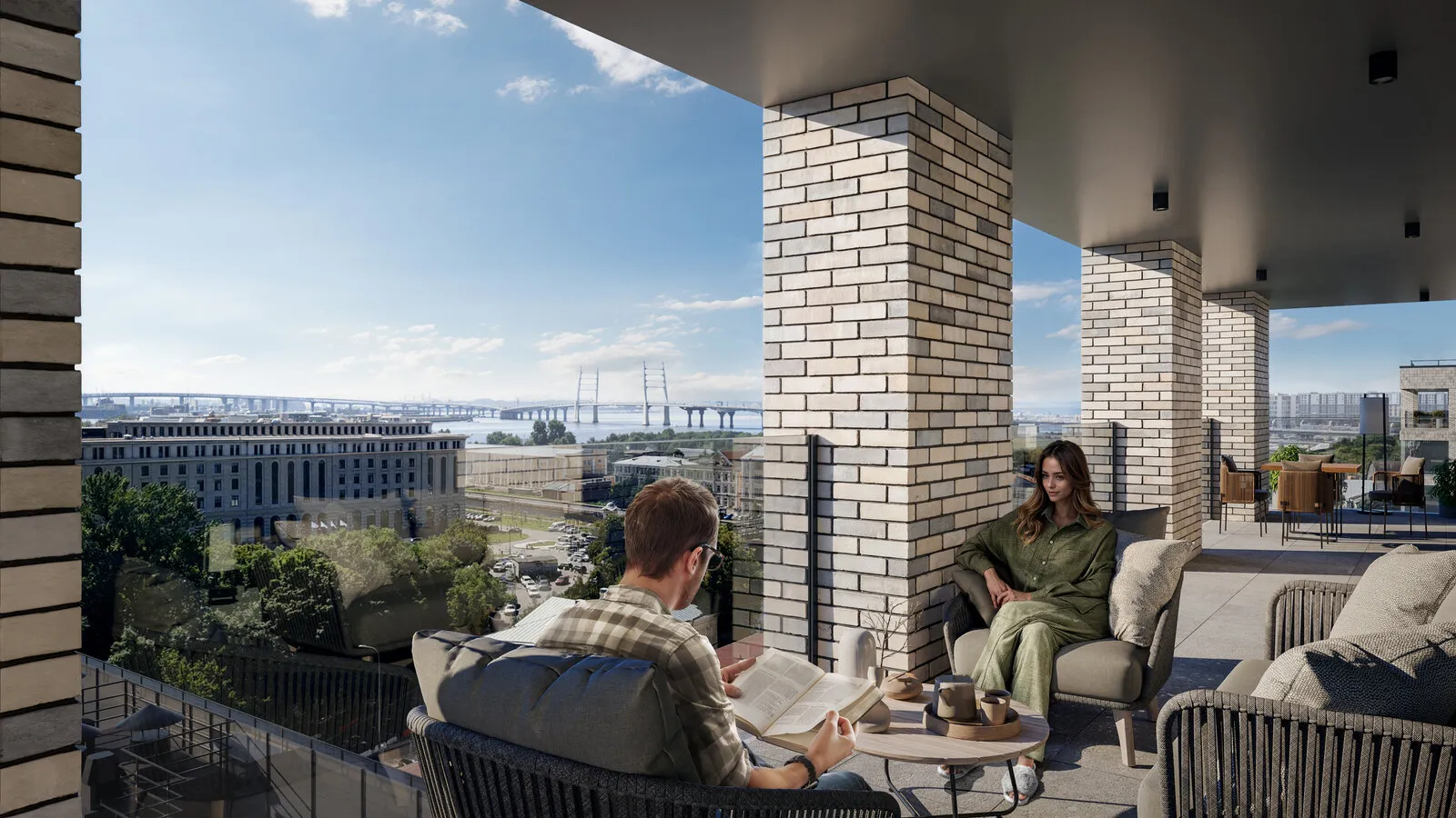 Residential Complex "Shipper 19"In "Shipper 19," the space is organized just as thoughtfully. There are a large number of panoramic apartments with terraces and floor-to-ceiling windows offering picturesque views of the Galerny Bay and the Gulf of Finland. Views of the water and the possibility to spend time outdoors right at home are a serious advantage influencing quality of life.