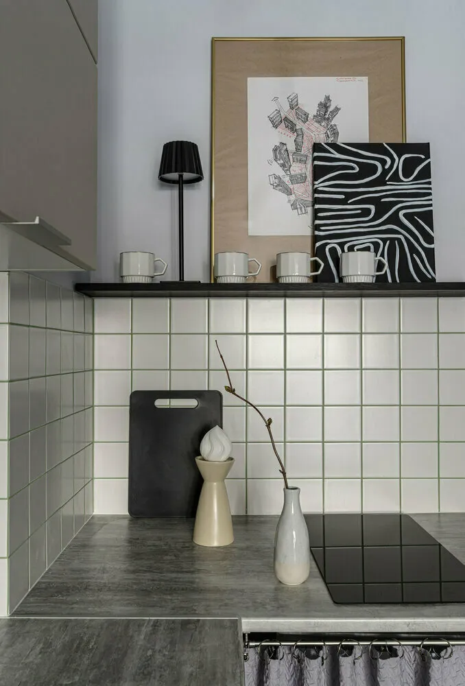 In Maria Sablina's project, the tiles are laid precisely level with even joints — neat geometry makes the kitchen visually cleaner.