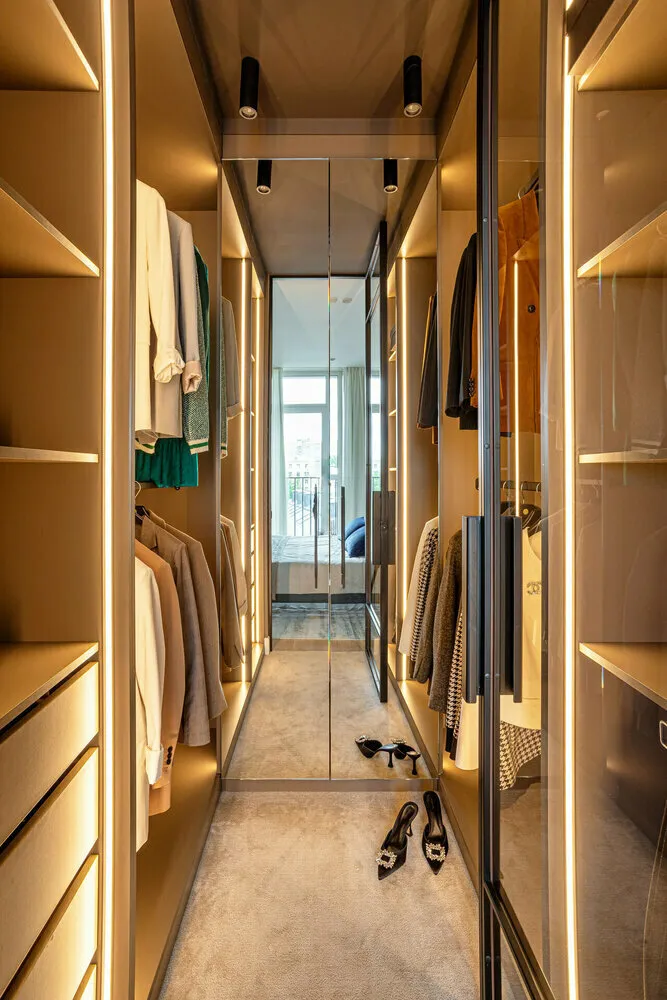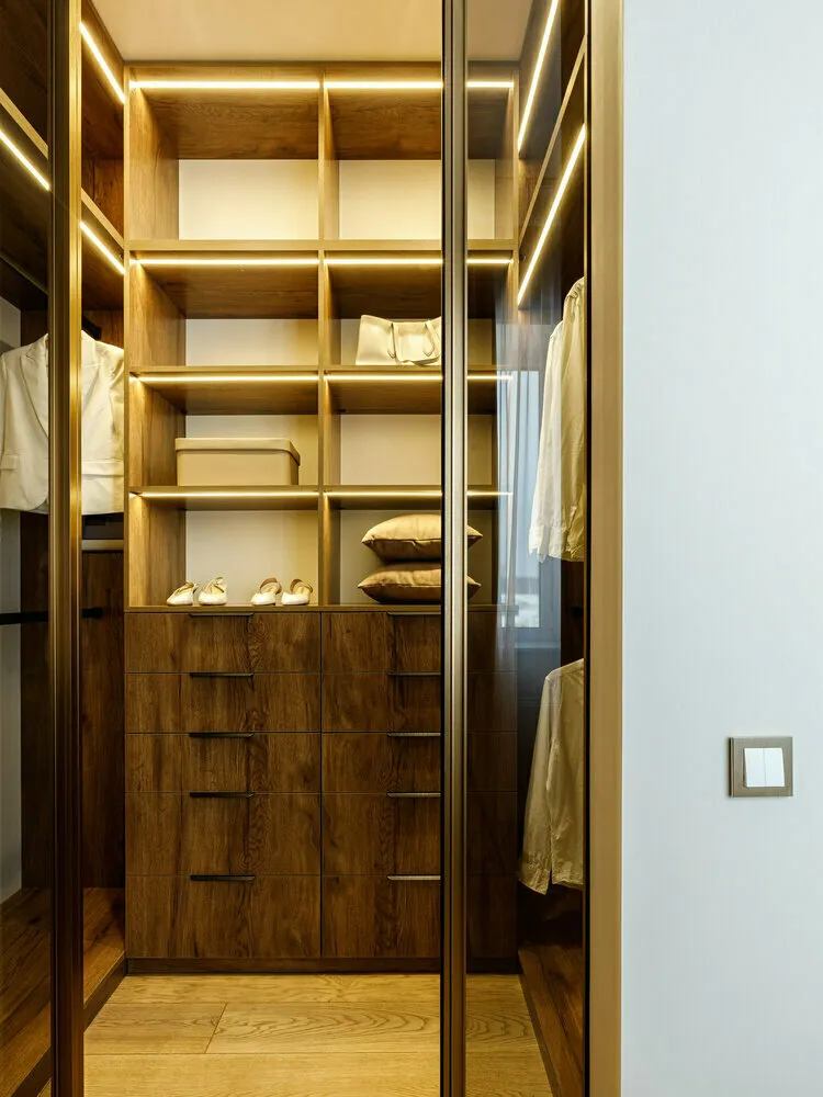 In the wardrobe designed by Eugen Shevchenko and Oxana Zavarzina, even warm lighting makes the space cozy and comfortable to use anytime.