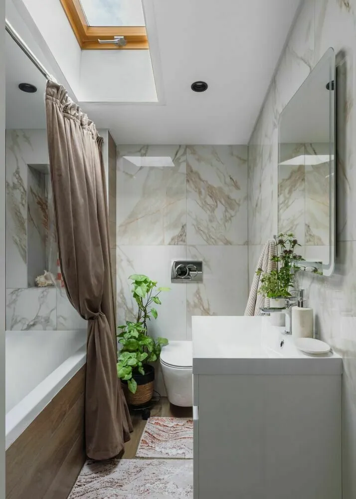 The bathroom curtain was custom-made. On the inside, a regular transparent curtain was used, and on the outside, luxurious velvet fabric. "This charming contrast of textures makes the interior stylish and original, turning a regular bath into an atmospheric event," Julia shares.