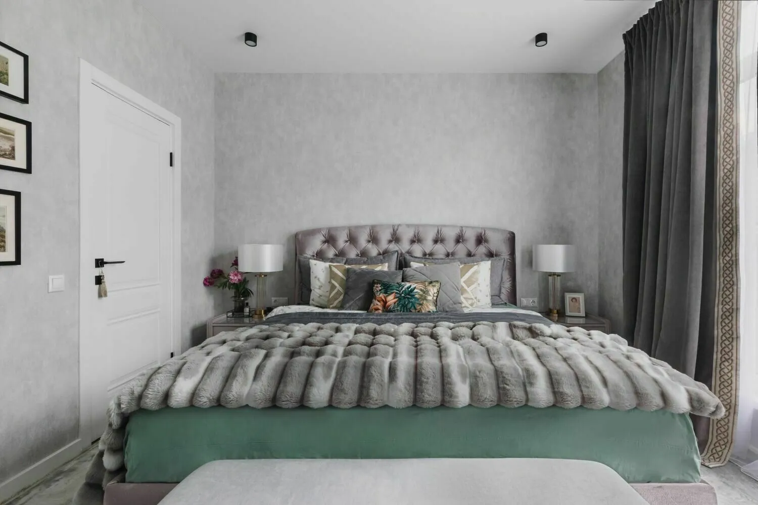 On the BedroomThe bedroom also turned out very cozy. At its center is a bed with a textured headboard, neatly made up with textiles and decorated with pillows that add extra comfort. The foot of the bed features a cushion—a functional element that allows for comfortable reading or rest. The walk-in closet in the bedroom was ordered from a private craftsman. Additional cabinet for the bathroom and mirror wardrobe in the hallway were also purchased from him.