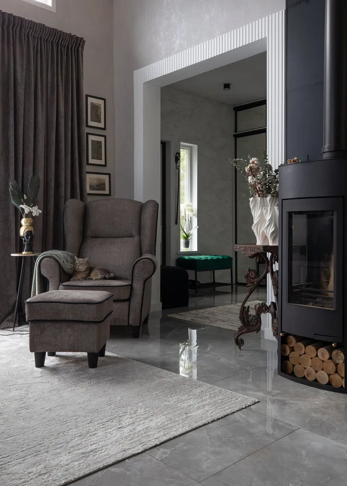 On the Living RoomThe centerpiece of the living room was a real small fireplace. It adds warmth and comfort, transforming the room into an ideal spot for rest and conversation. The sofa and armchairs were custom-made with individual fabric and design choices. The TV cabinet, purchased with a significant discount, turned out to be a real find. Julia was incredibly satisfied with this purchase because it fully met all size, color, and functional requirements. It fits perfectly into the room's overall style, combining aesthetics with practicality.