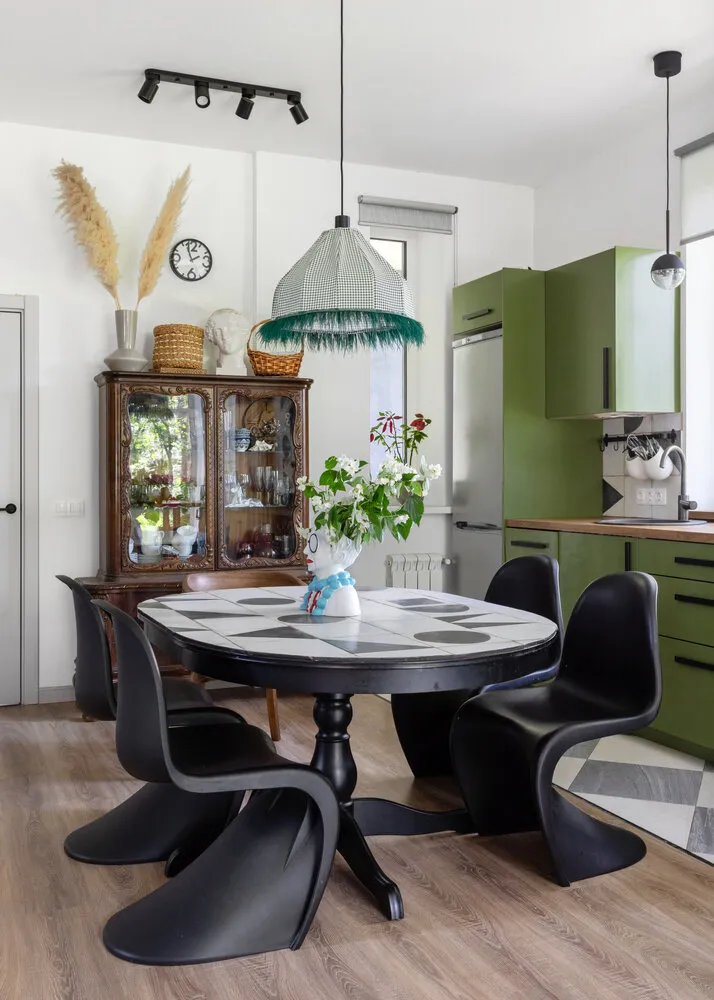 The kitchen is made by a well-known Swedish brand, and the cabinets were designed based on Irina’s sketches and painted in natural green. The pattern on the backsplash matches the dining table top and floor tiles in the kitchen zone. The main accent is a vintage hutch. After the house was built, Irina searched for months to find a buffet for this spot. One day, relatives of her mother’s friend called and offered to take the hutch as a memory of someone dear.