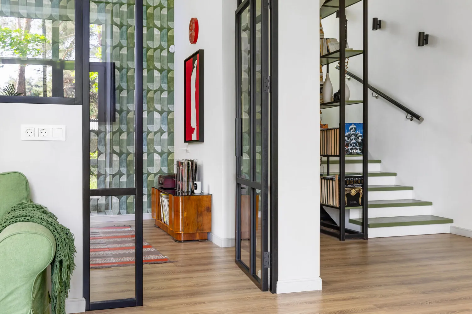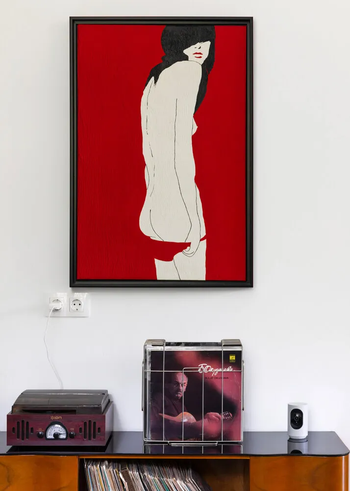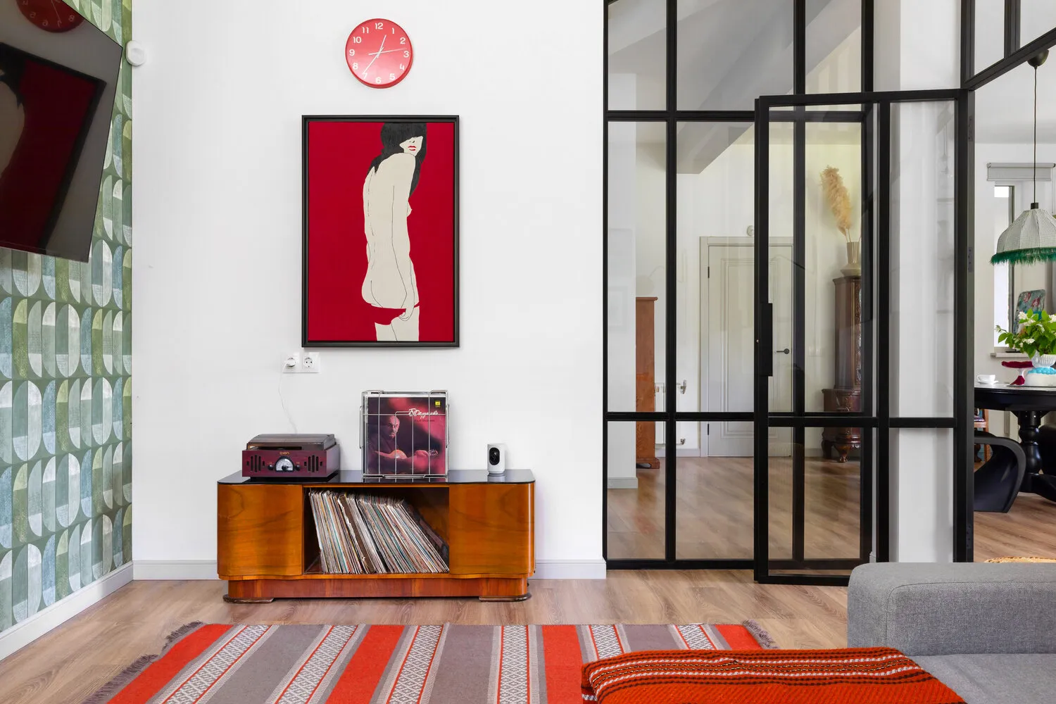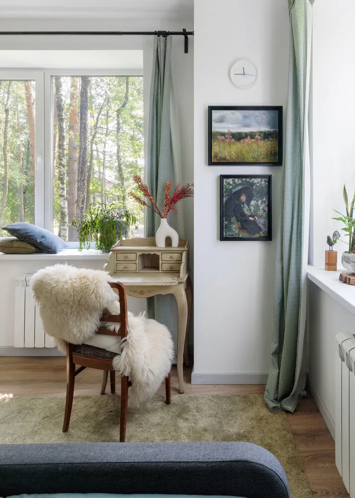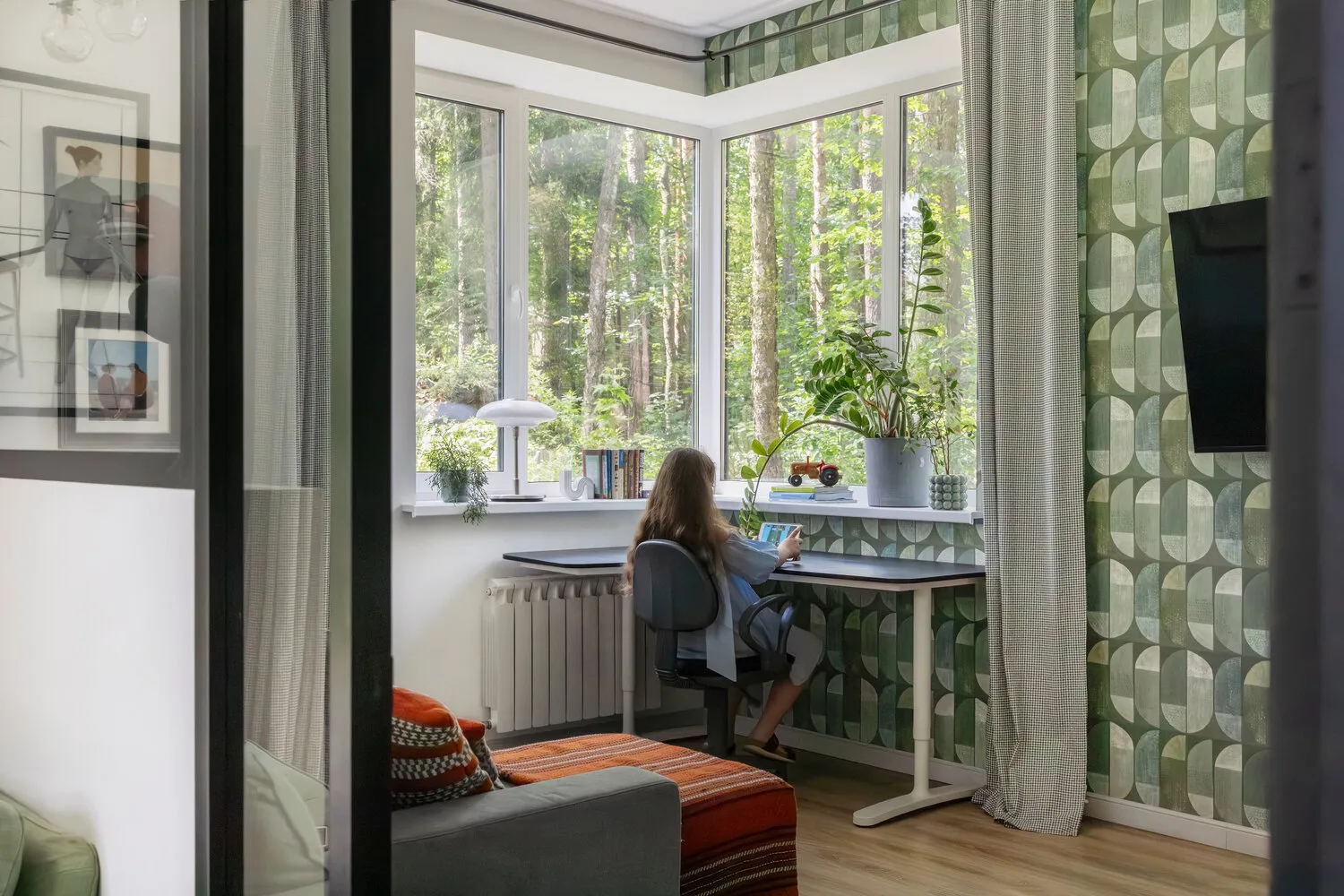 This room features a corner window through which evening sunlight streams in, creating a cozy atmosphere. To let more light into the kitchen-living room, a large false window was installed between it and the office. In the office, the vintage console with a record collection stands out — it adds nostalgia. The painting by artist Julia Gantie perfectly complements the interior and highlights the uniqueness of this corner.