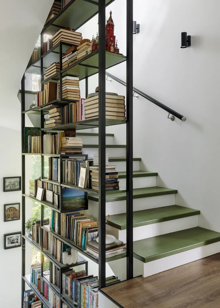 The most unusual and complex item in the house is a nine-meter bookshelf that reaches the ceiling. It serves as an elegant railing for the staircase and a storage space for many books and decorative items. When the bookshelf was ready, it turned out that it wouldn’t fit through any of the doors. The window on the staircase had to be removed and a wooden ramp built to carry it in, then reassembled into three parts in the center of the staircase.