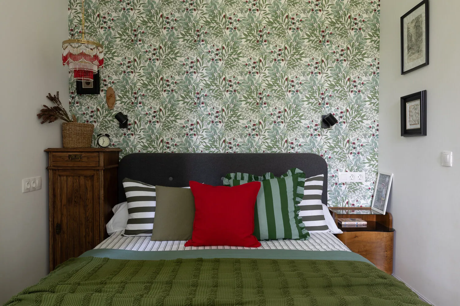 For wall finishing in the bedrooms, Irina used plaster and white paint — she wanted to create more open space for paintings and decor. The visual accent in each room is the wall behind the bed, covered with wallpapers featuring beautiful prints. The vintage chandelier in the main bedroom is made of Czech glass. It belonged to Irina’s grandmother. The antique side table was restored by the designer herself.