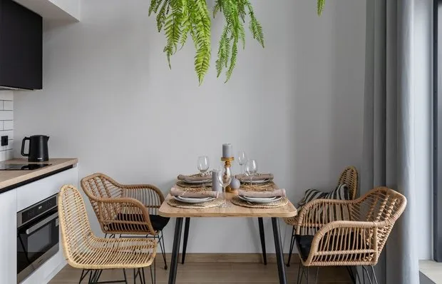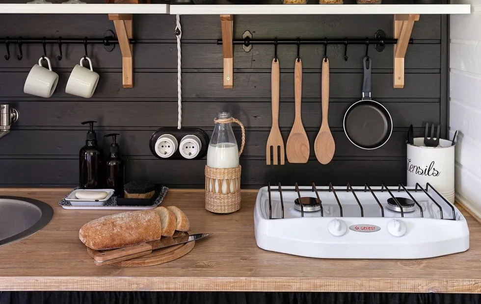 In a space-constrained environment, it's crucial to choose compact yet functional household appliances. Therefore, a refrigerator 120 cm high with a freezer, a dishwasher 45 cm wide, and a 2-burner cooktop were installed in the kitchen.