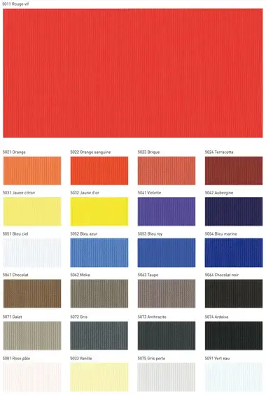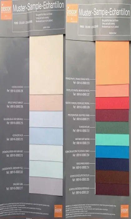 - DESCOR FR intense color (vivid colors) peach, eastern red, ruby, olive, menthol, cobalt blue, indigo, chocolate, bordeaux (dark red) – width 5.1 m;