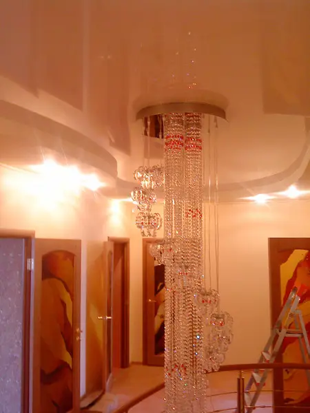 Chinese film is produced with a width of 3.1 to 5.5 meters, the thickness is on average 0.13 mm. The film composition is PVC. The material is non-flammable, installed with heating. The choice is available in matte, glossy or satin film. The advantages of Chinese suspended ceilings: The main advantage of the film produced in China can be considered the width of the strip up to 5 meters, which allows installing seamless ceilings on large areas. This is the maximum value, other manufacturers do not offer such strip widths.