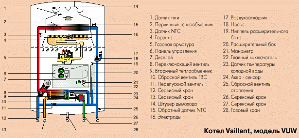 VAILLANT (Vaillant) - a German company with official representations in all European countries, manufactures both two-circuit (with room heating function and hot water supply) and single-circuit (heating rooms and supplying hot water, but using an additional boiler for the latter) boilers.